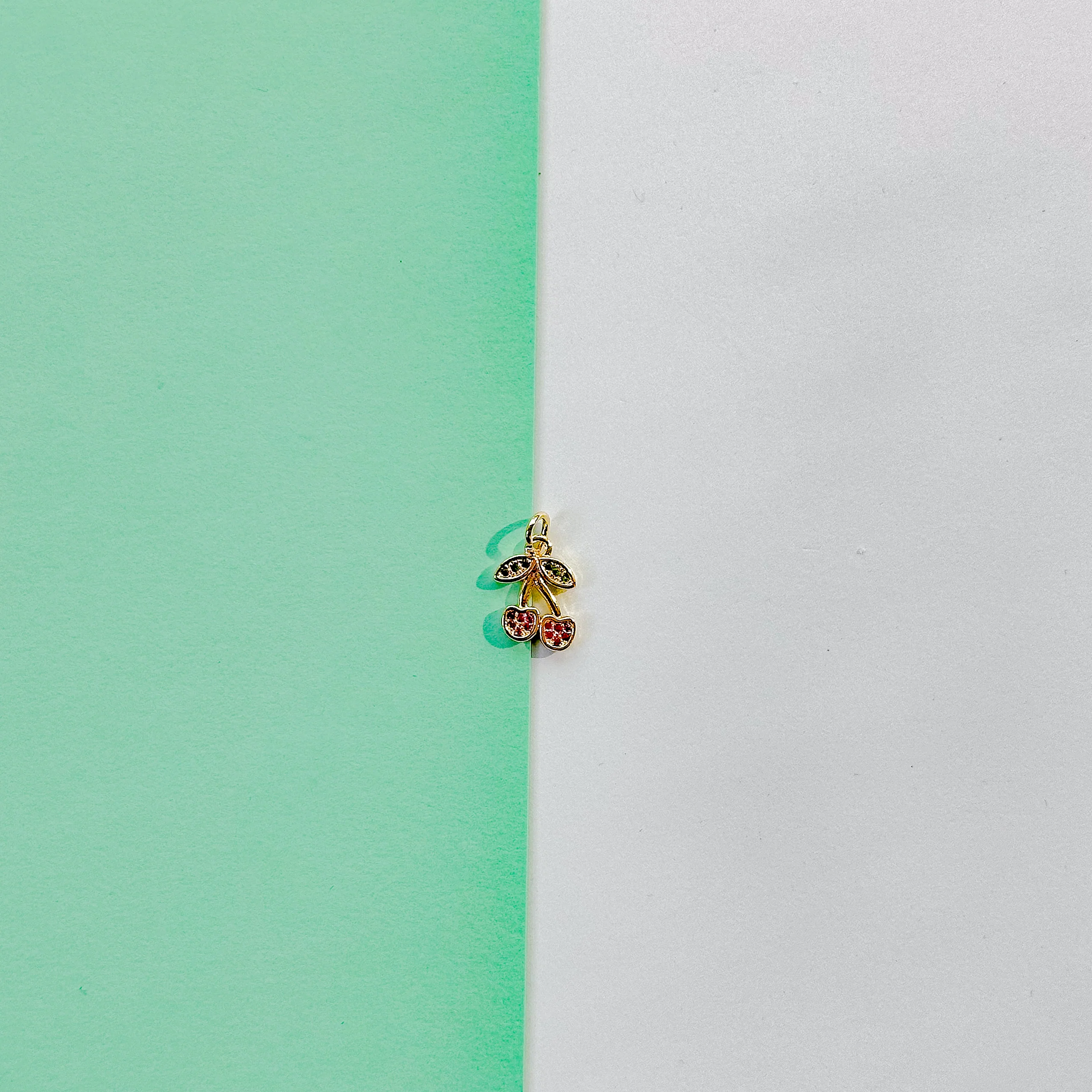 A detailed electroplated gold cherry charm with with green and pink crystals as accents.Â
