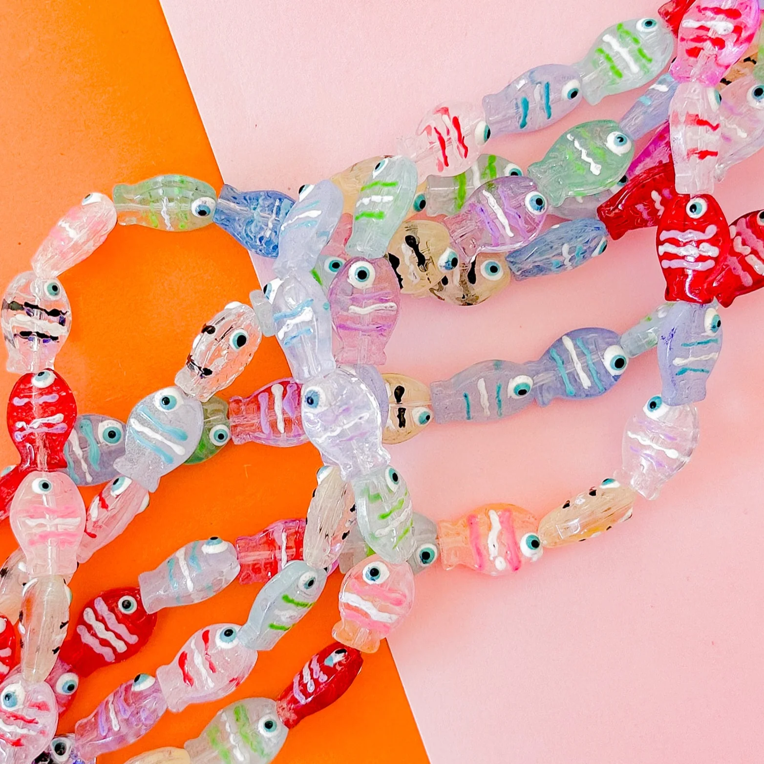 Translucent, textured hand-painted fish beads made of glass in a rainbow of colors.Â