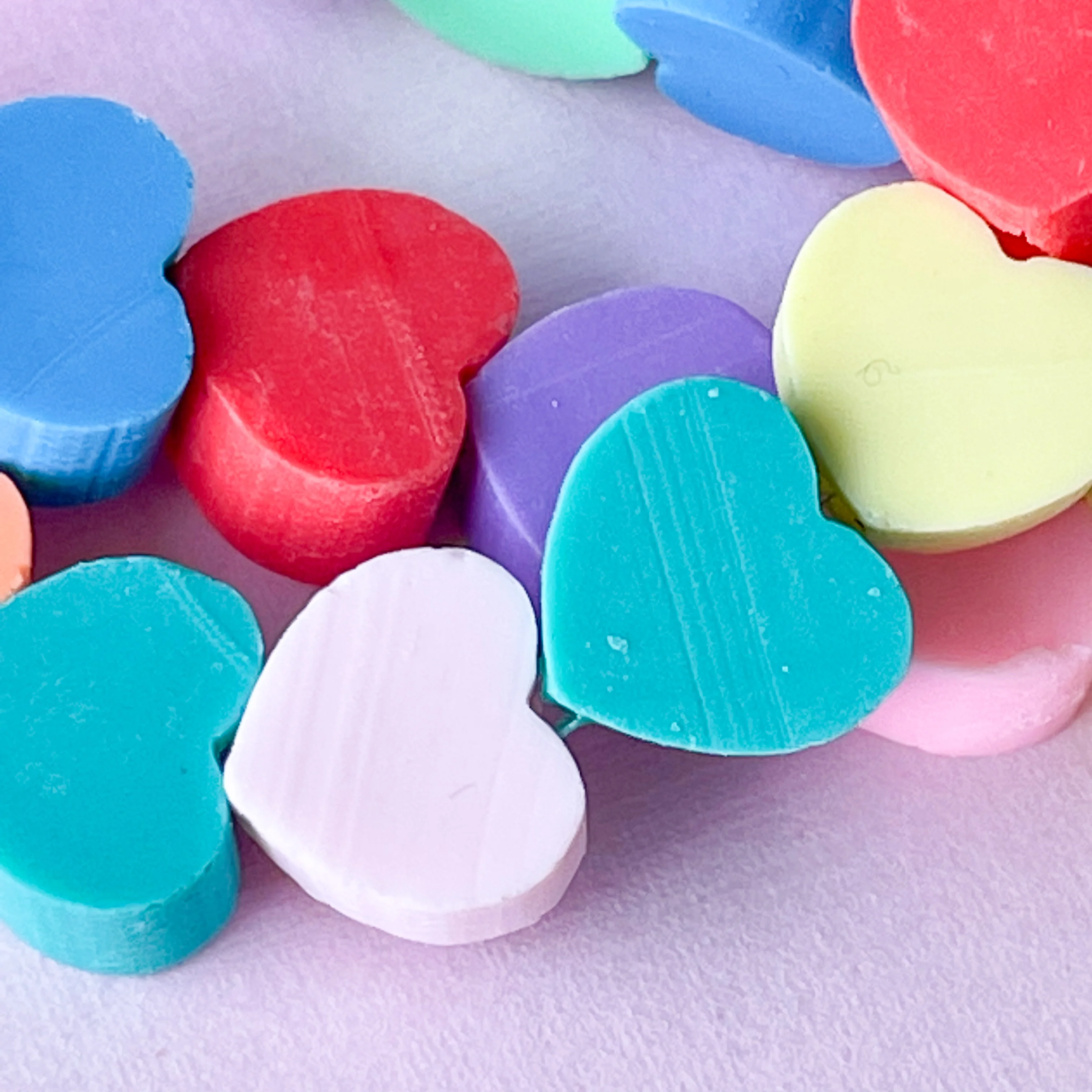Thick, solid-color polymer clay heart beads ranging from hot pink to teal, to true blue to butter yellow. Each strand is a unique mix.Â