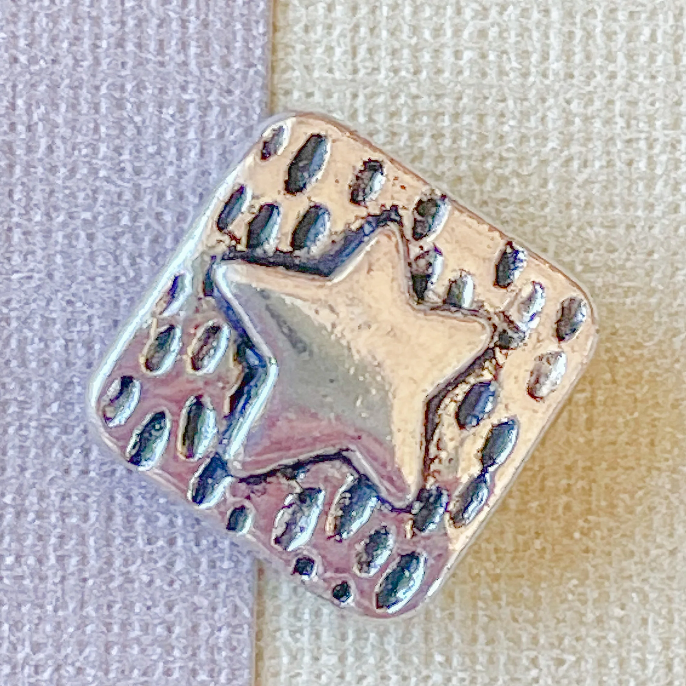 Square chiclet silver pewter beads with a carved star & textured background.Â