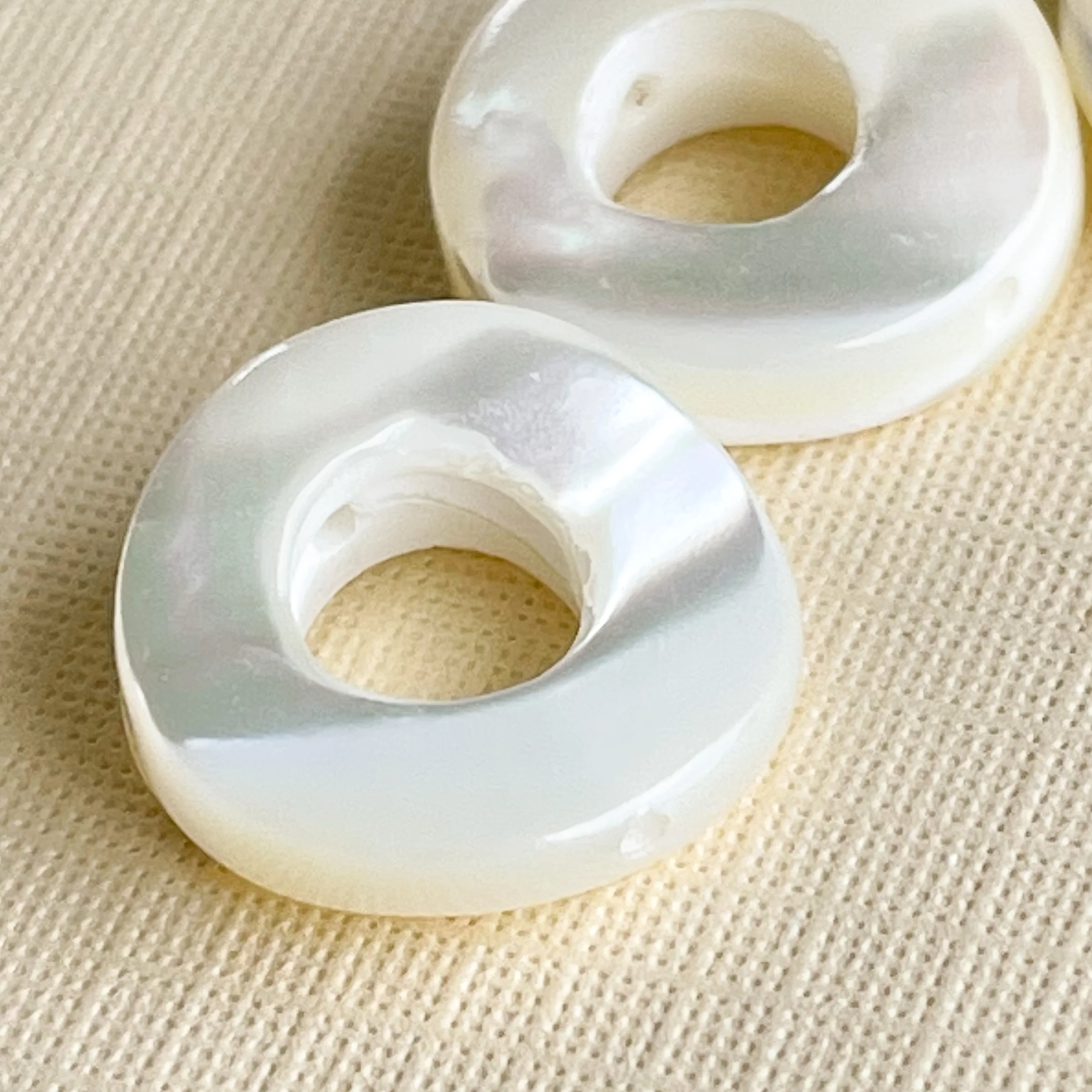 Smooth mother of pearl cut into circle shapes. These beads have small stringing holes, but can also be strung through their large center holes.Â