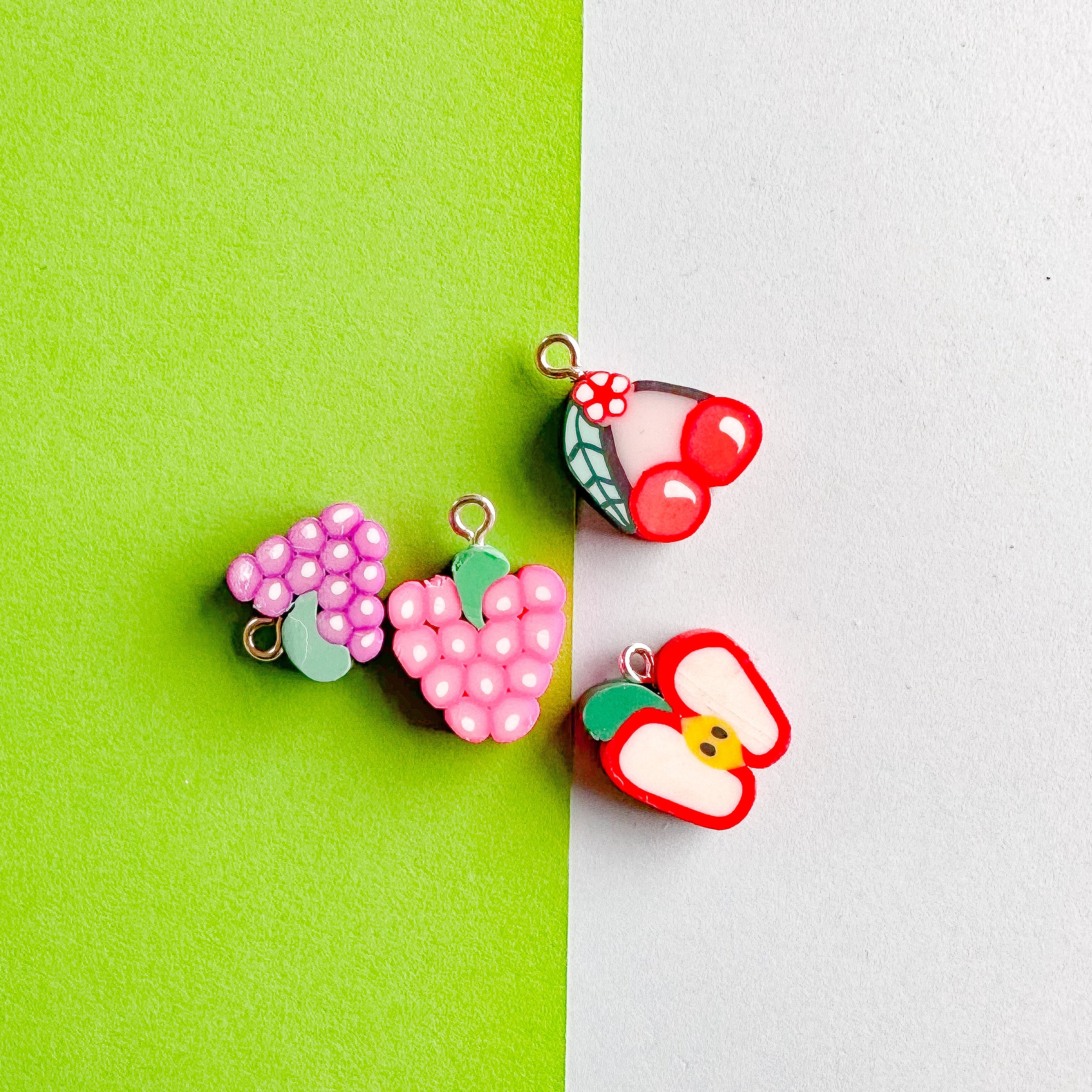 A set of 4 irresistibly fun fruit charms in lightweight and bright polymer clay. Grapes, Apple, Pink Raspberry and Cherries. Stainless steel loop at tops. Â
