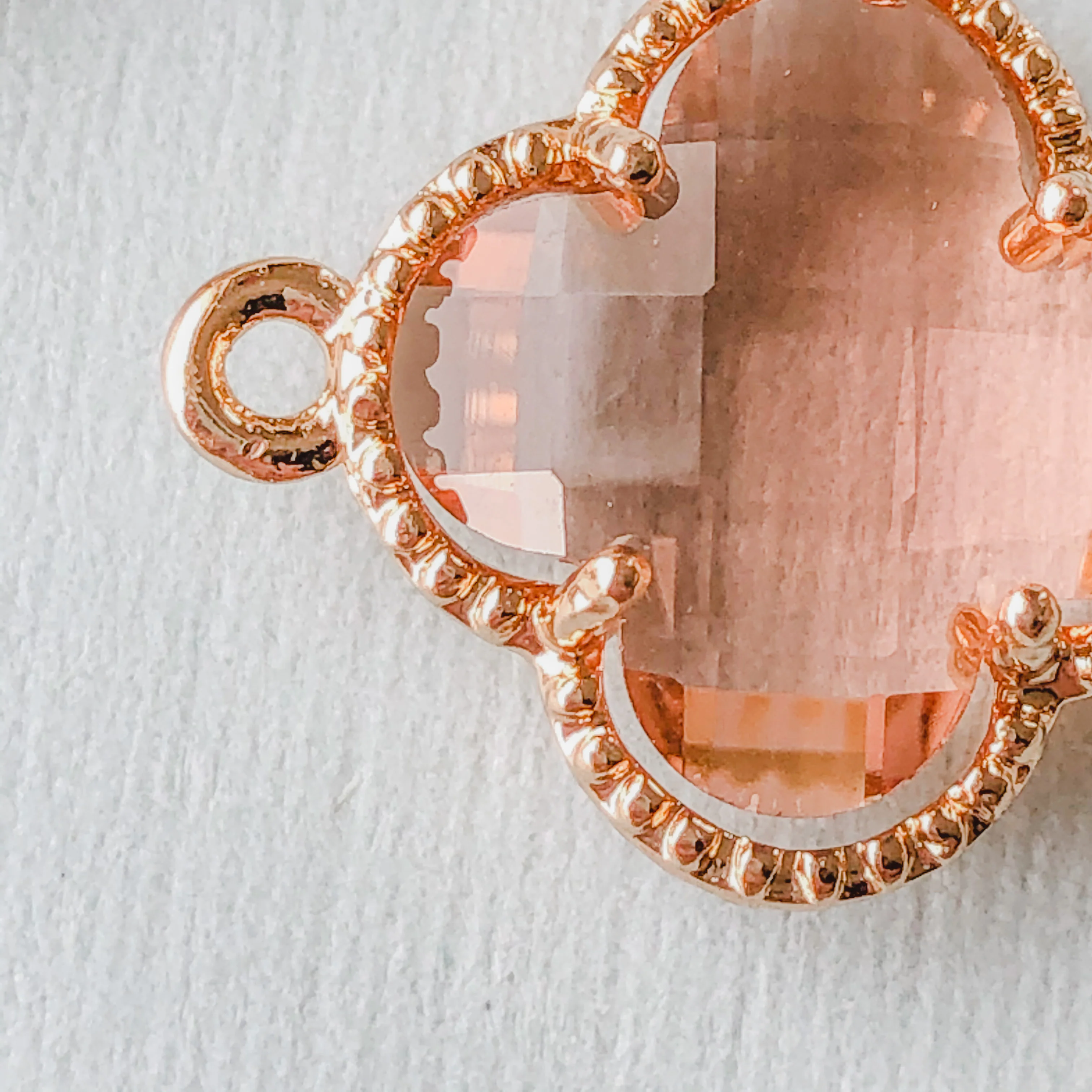 Transparent warm pink faceted crystal set in an electroplated gold connector with decorative edges.Â