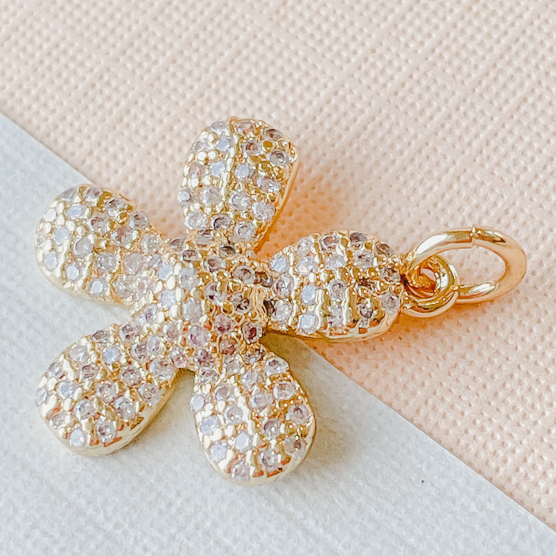 An irresistibly sparkly retro-inspired flower charm. Each charm has a bail and a loosely attached open jump ring.Â