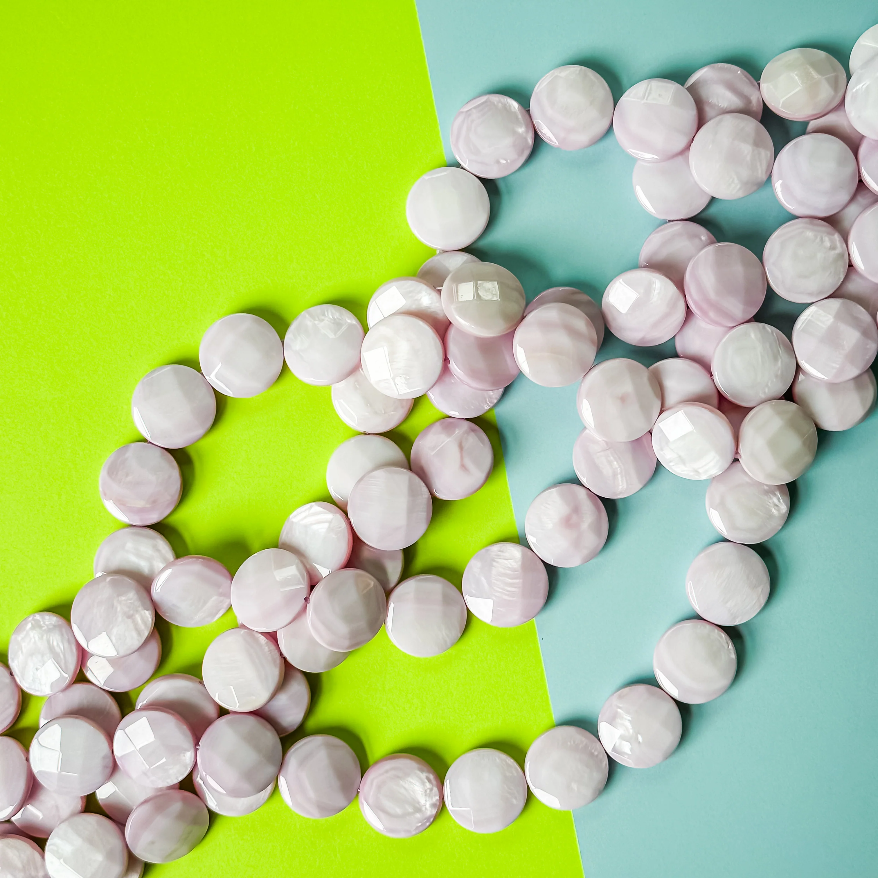Beautiful, shimmering Mother of Pearl coins with a soft, light purple-pink hue.Â