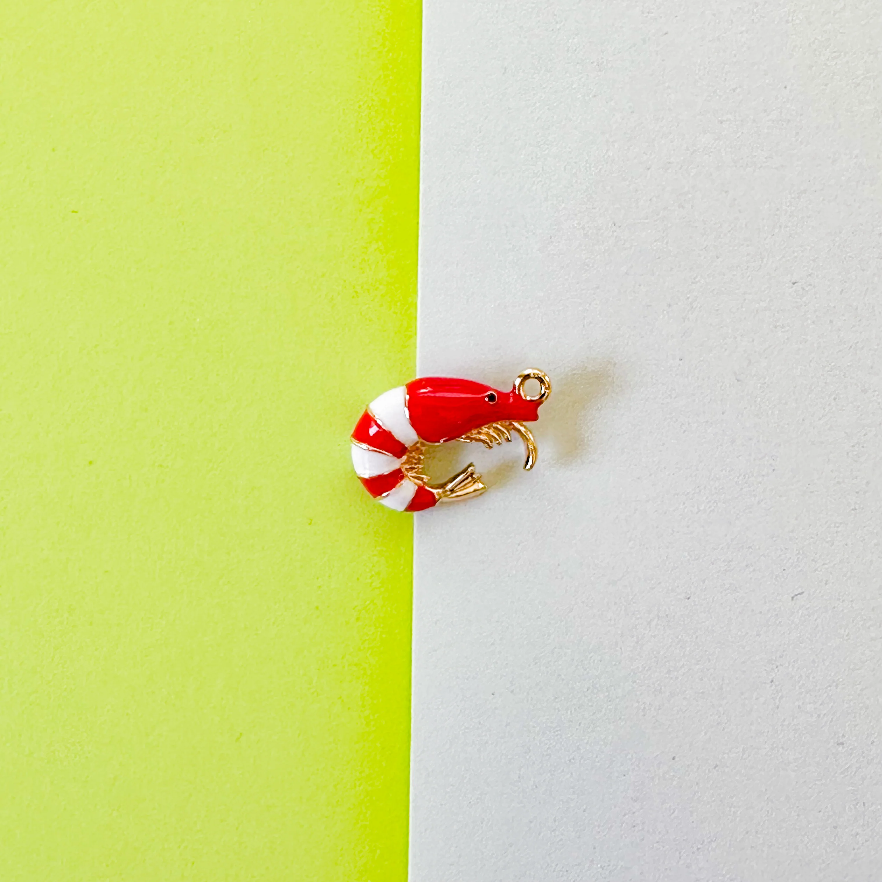 Gold plated happy shrimp charm is covered in red and white enameling. Fixed, soldered ring at top.Â