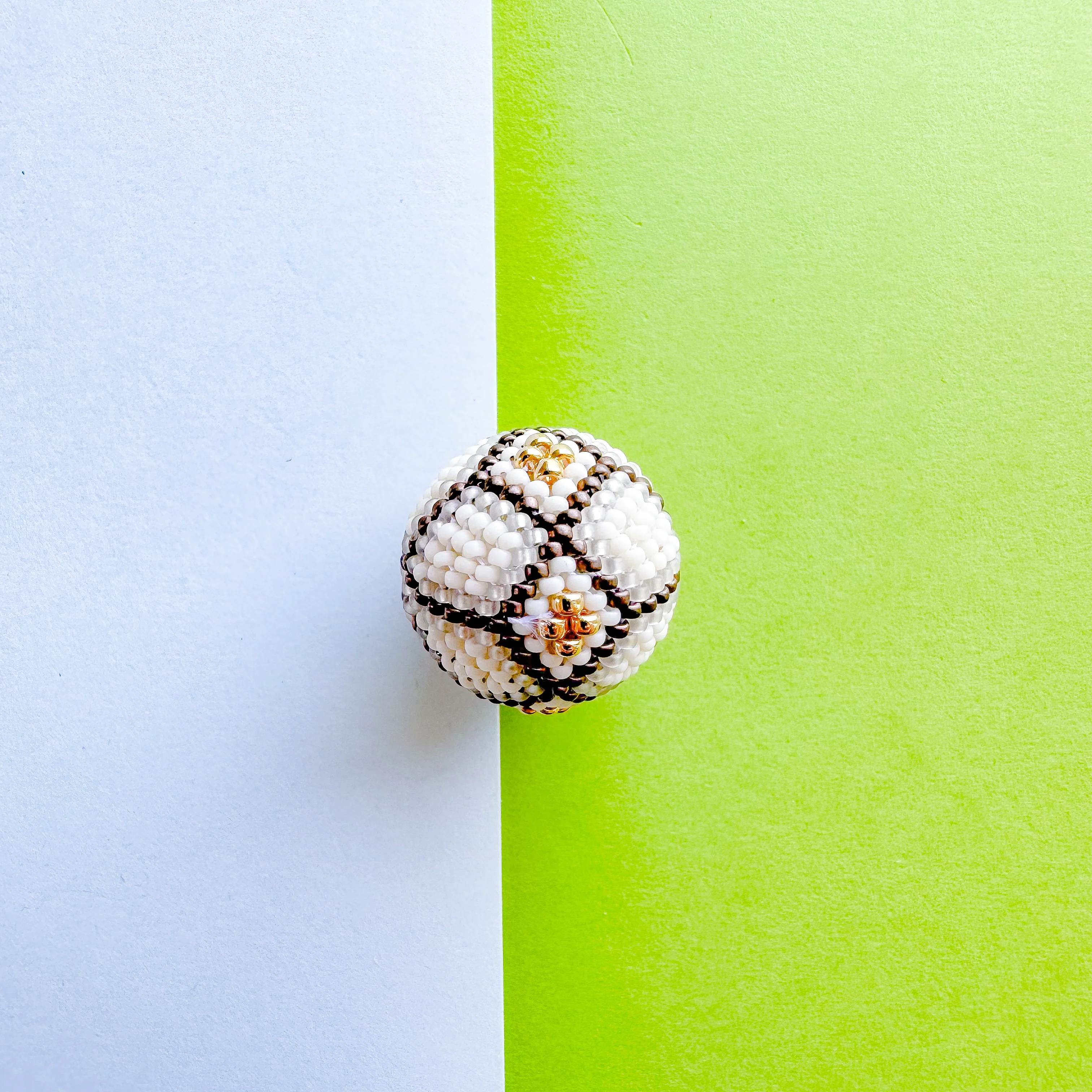 A blend of matte, metallic and iridescent Miyuki seed beads woven around a plastic or wooden core bead. Geometric gold clover motif. Handmade in Bali and Nepal, each one is truly unique.Â