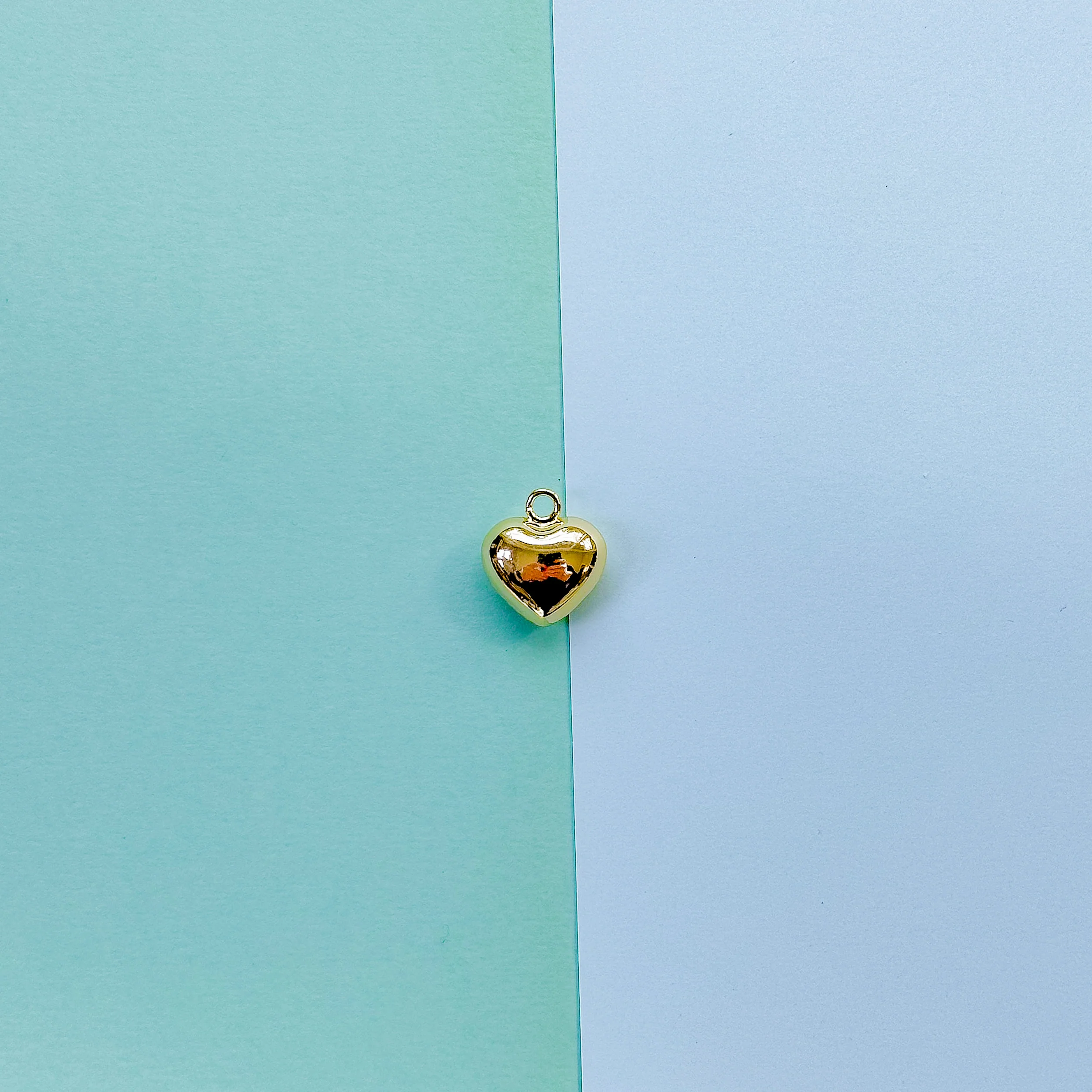 Shiny gold electroplated puffy heart charm is dimensional on both sides. Soldered, fixed ring at top.Â