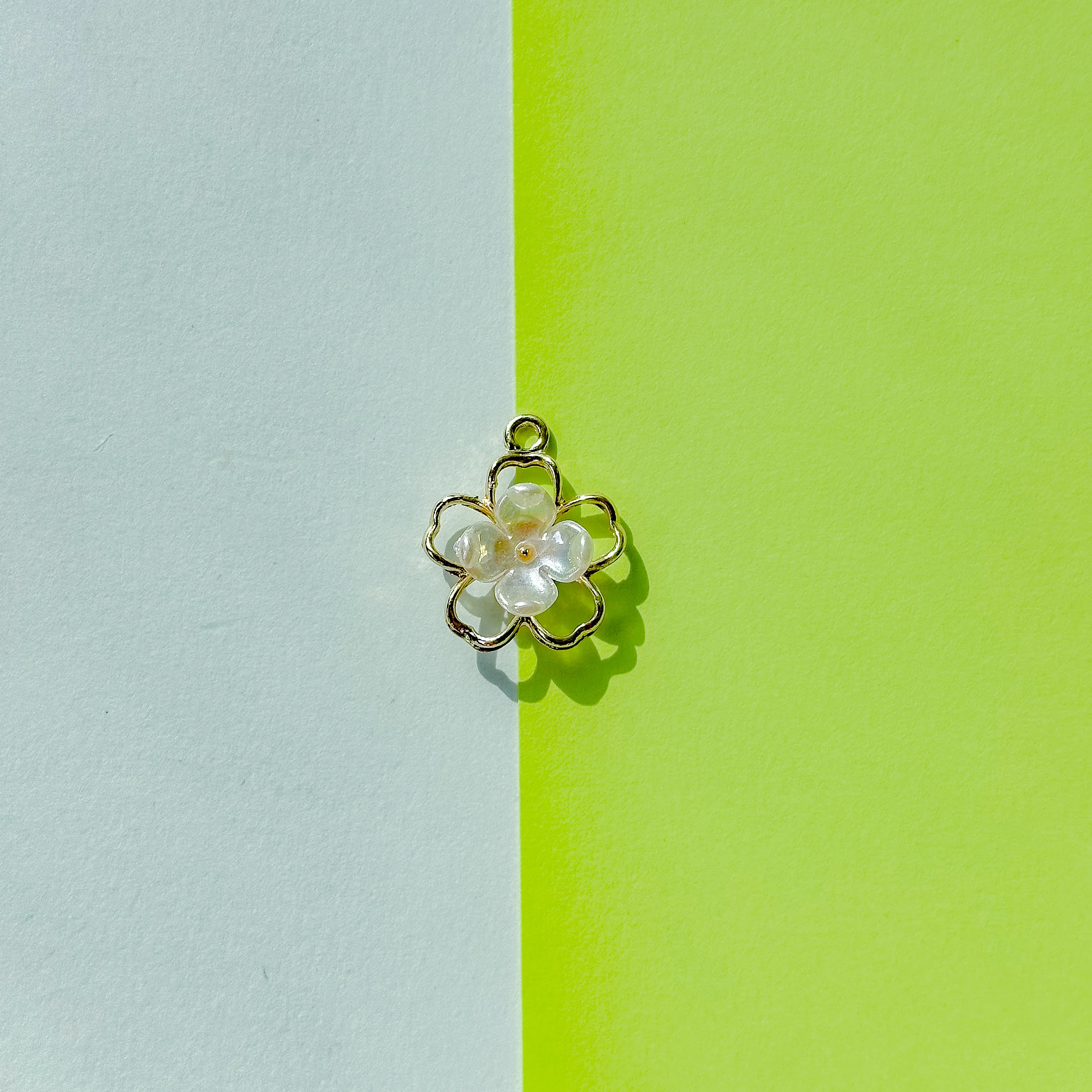 Plated gold flower outline adorned with glass pearlized dimensional center.