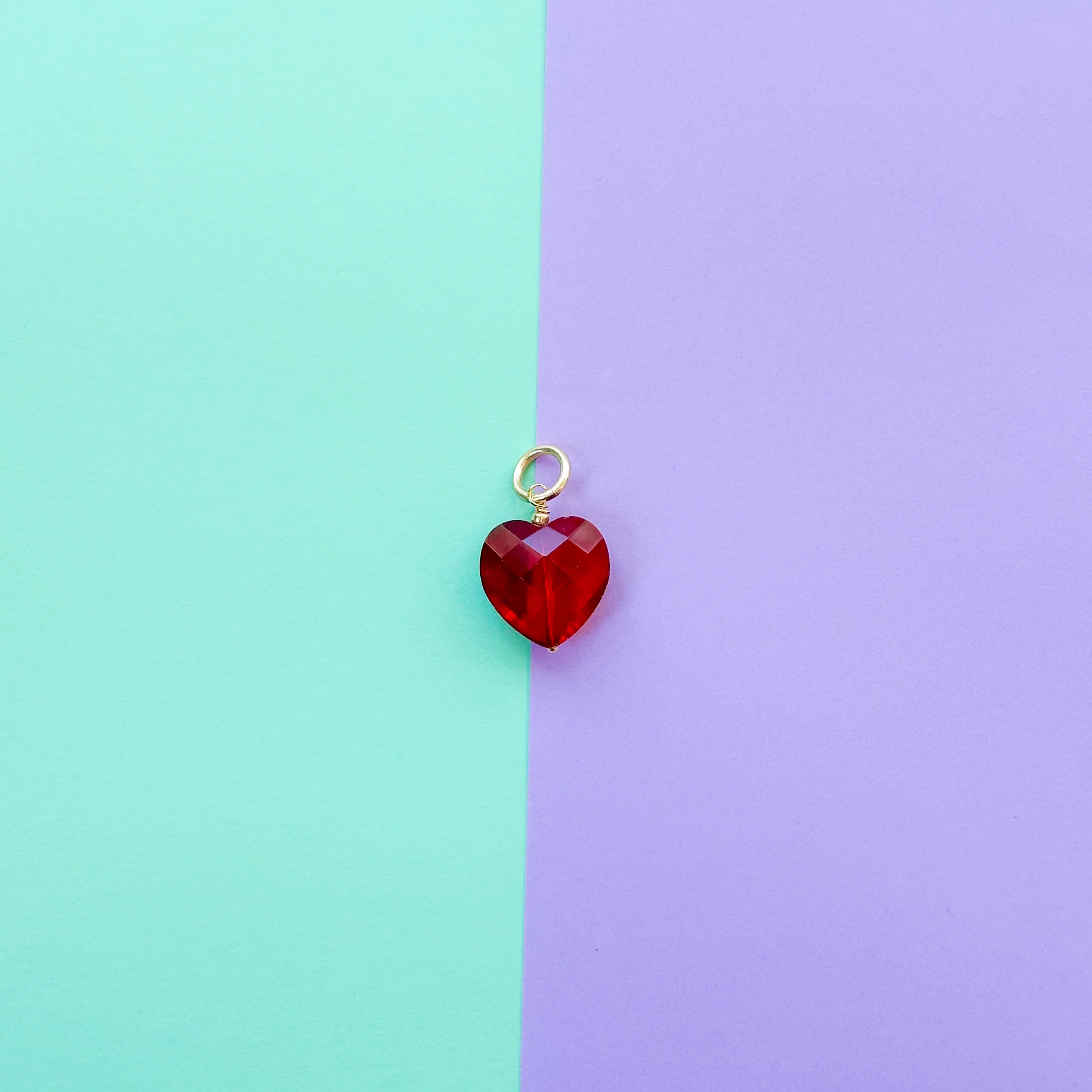 Rich, ruby red faceted heart-shaped crystal with gold plated findings and generous open ring at top.Â