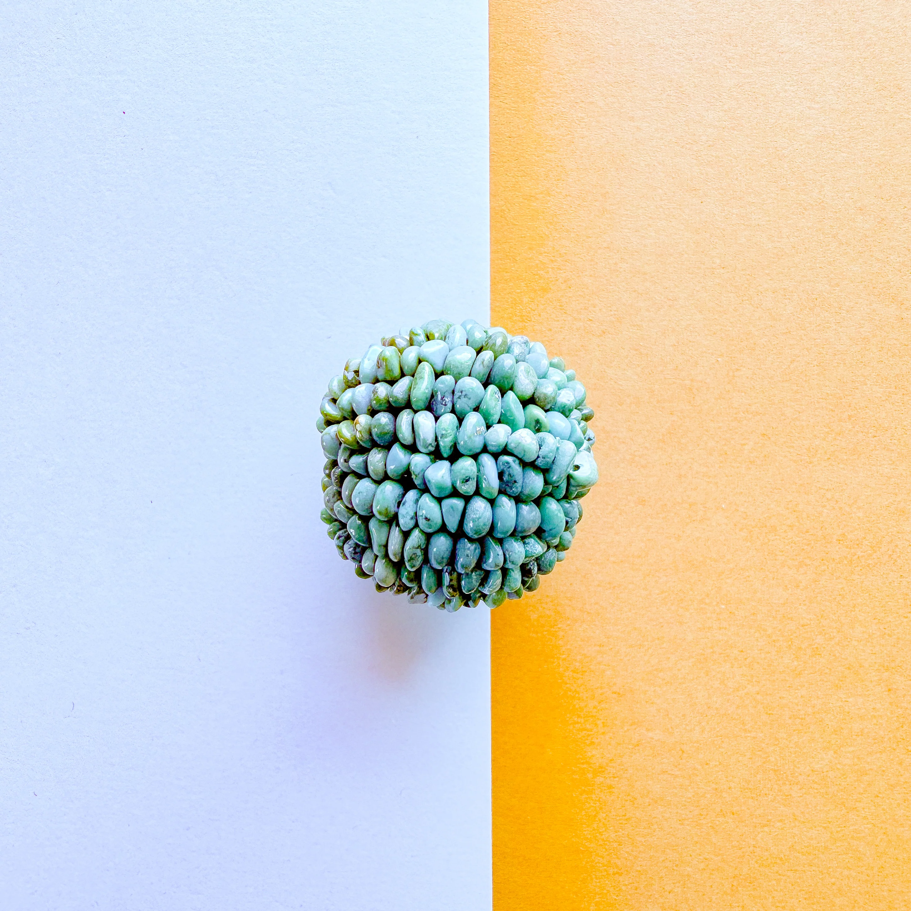 Natural, smooth turquoise pebble beads strung around a plastic or wooden bead with a metal reinforced hole. Each bead is a handmade work of art.
