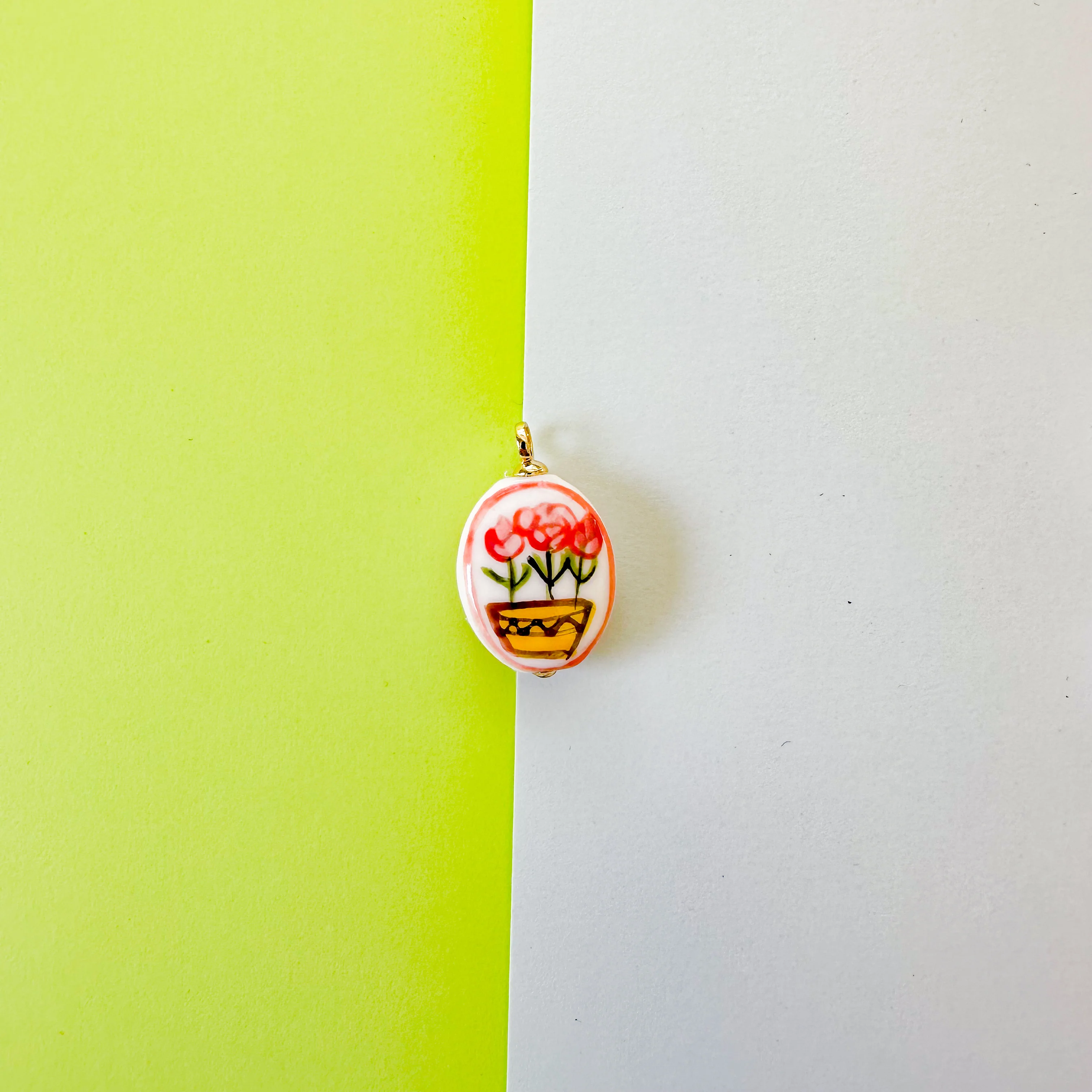 White puffed oval is the perfect canvas for this miniature masterpiece of hand-painted flower baskets on both front and back. Gold electroplated fixed, soldered bail.Â