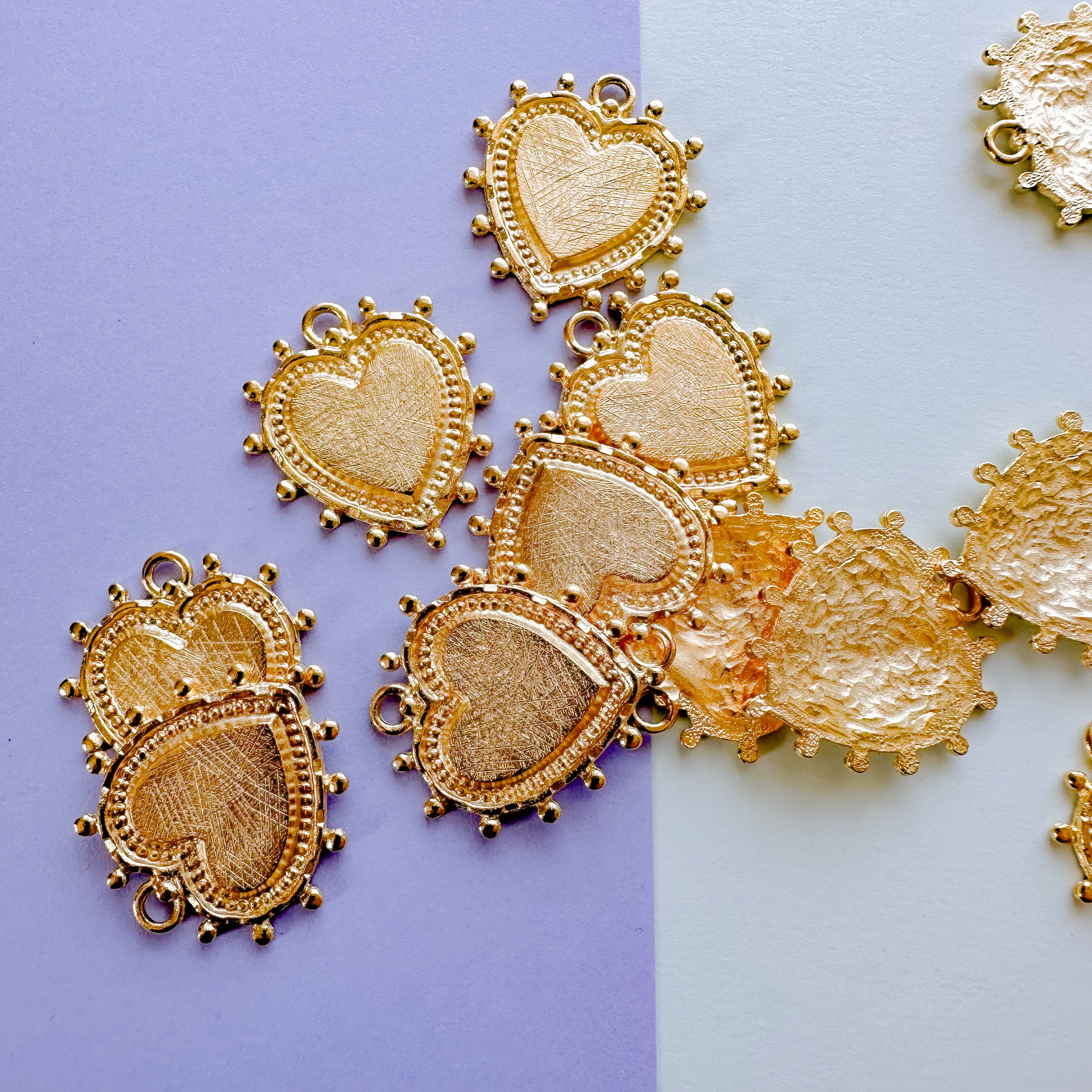 A shiny, satin gold electroplated heart charm with tasteful, granular embellishments and artistic texturing. Fixed ring at top.
