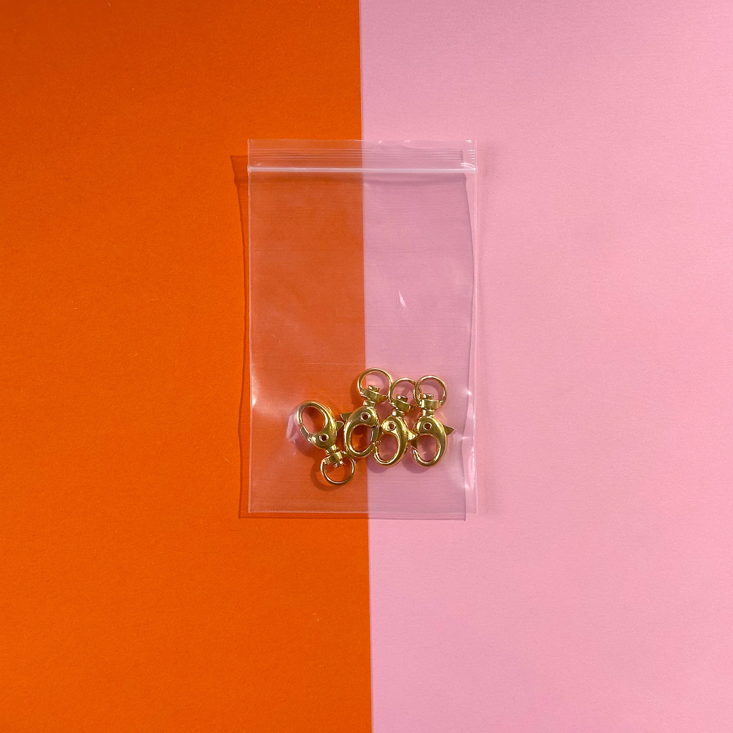 Currently our one of our largest swivel clasps, these shiny gold clasps are perfect for bag charms, key chains, or statement clasps. Gold electroplating.Â
