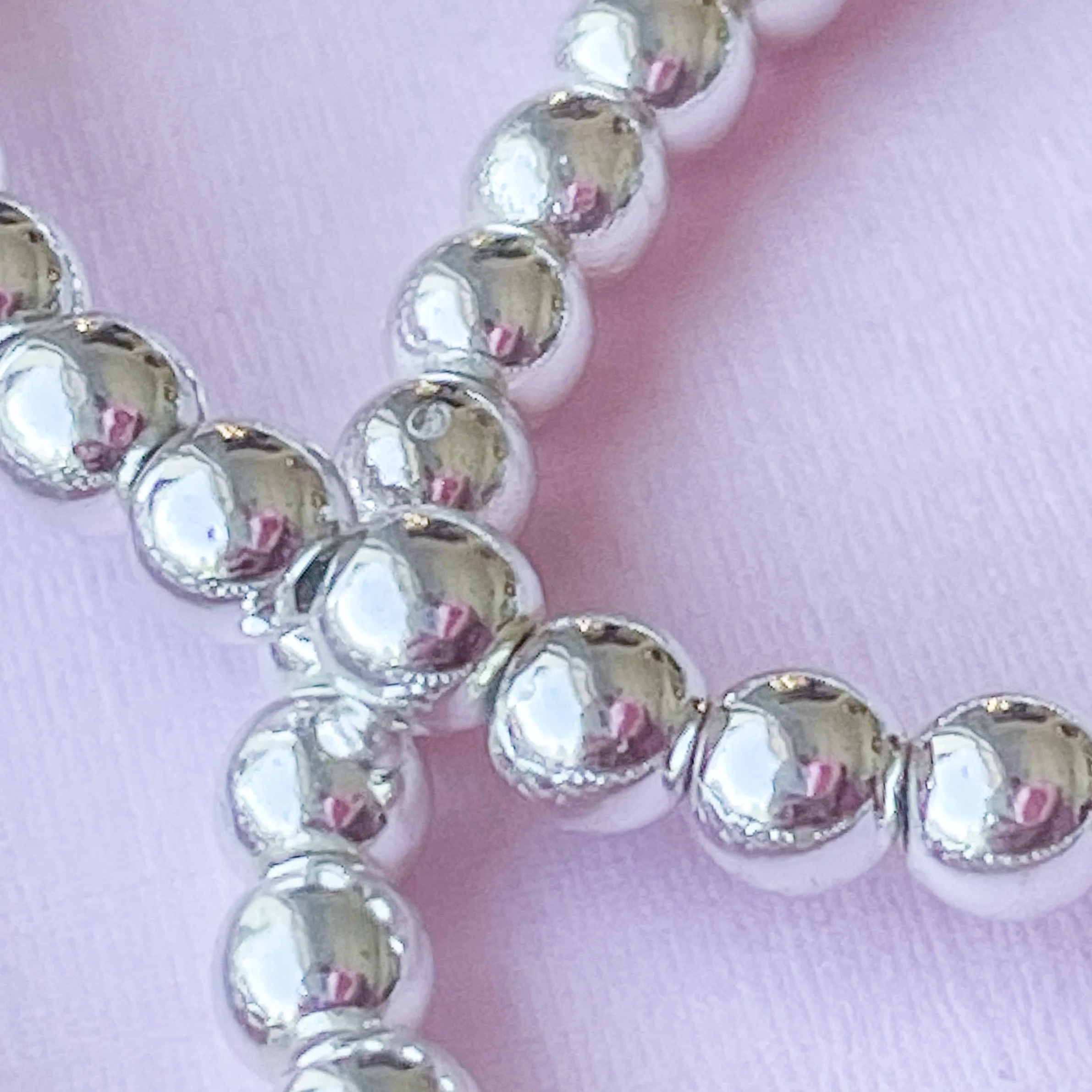 Natural hematite stone, carved into smooth rounds and electroplated for a mirrored shiny silver finish.