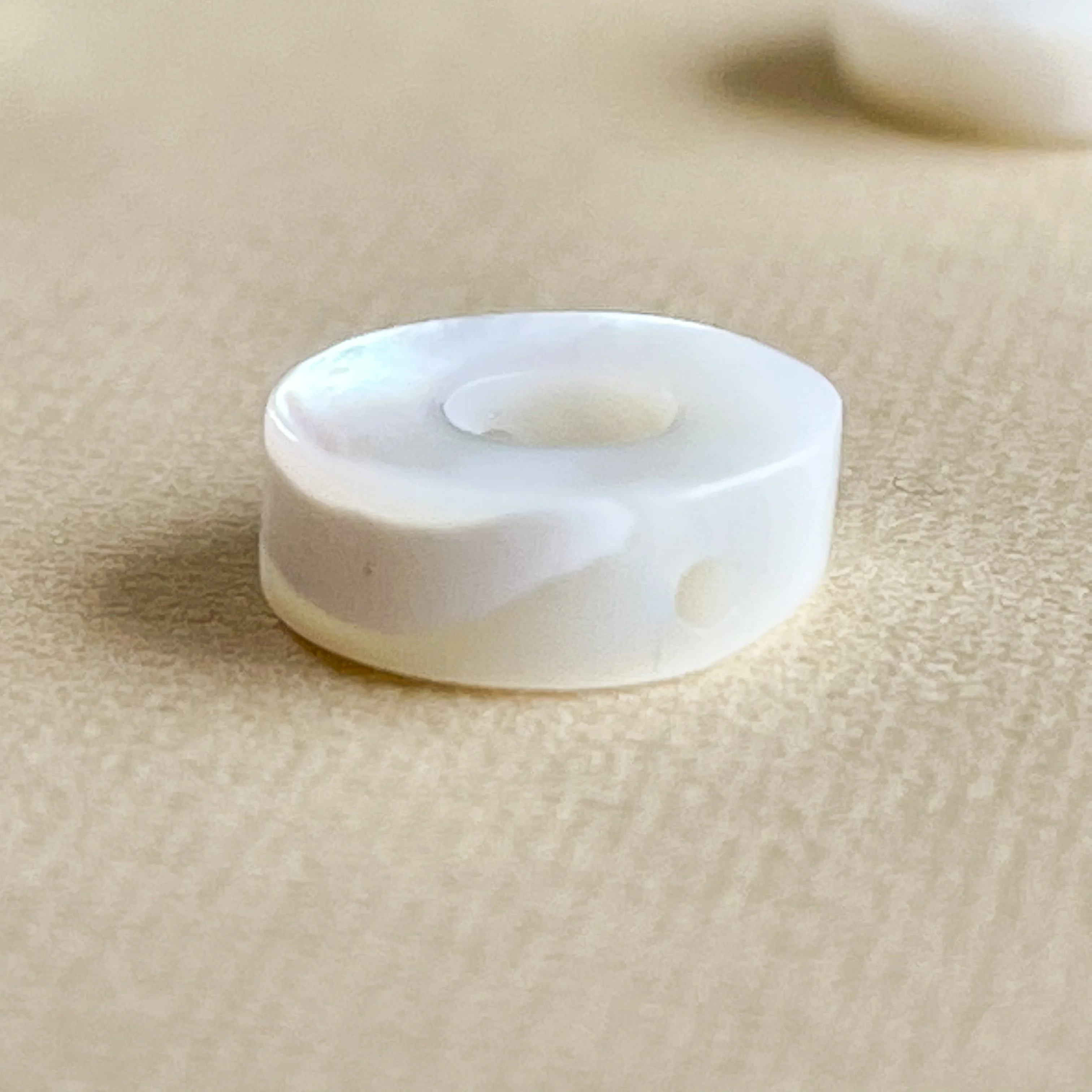 Smooth mother of pearl cut into circle shapes. These beads have small stringing holes, but can also be strung through their large center holes.Â