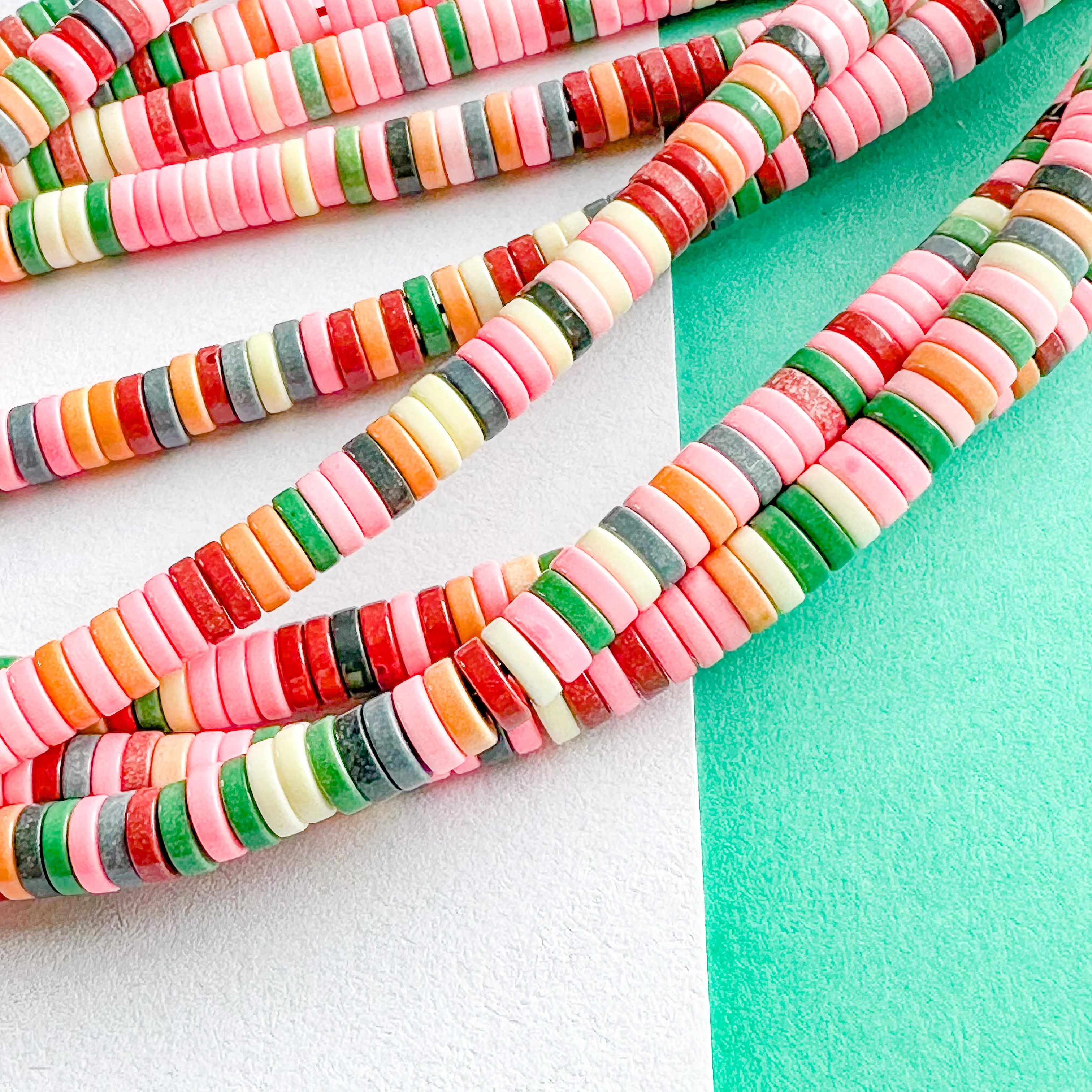 Saturated, color-treated snow agate carved into smooth heishi beads.