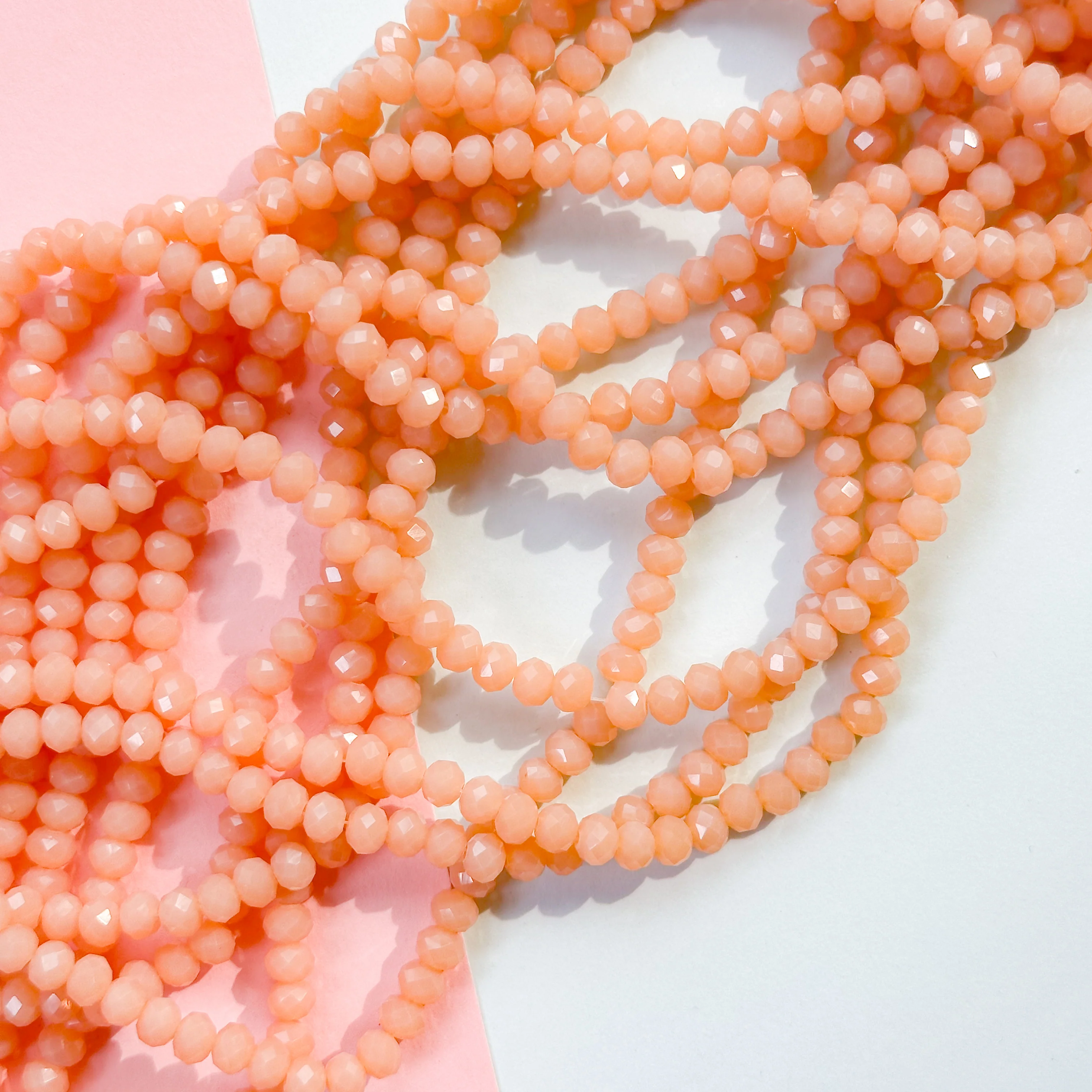 A strand of faceted, semi-opaque peach crystal rondelle beads.