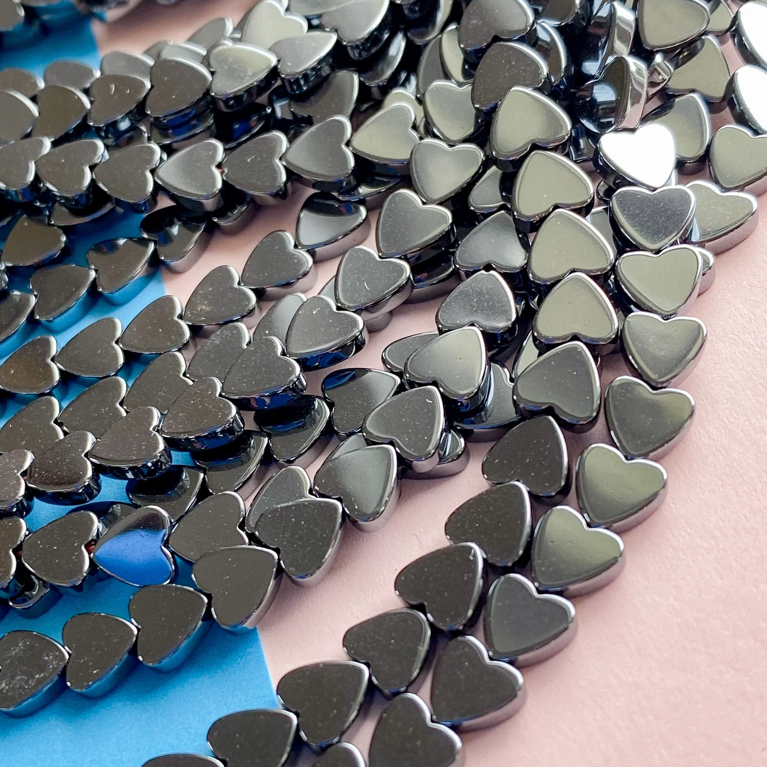 Shiny, natural black Hematite hearts in a medium flat size.Â
