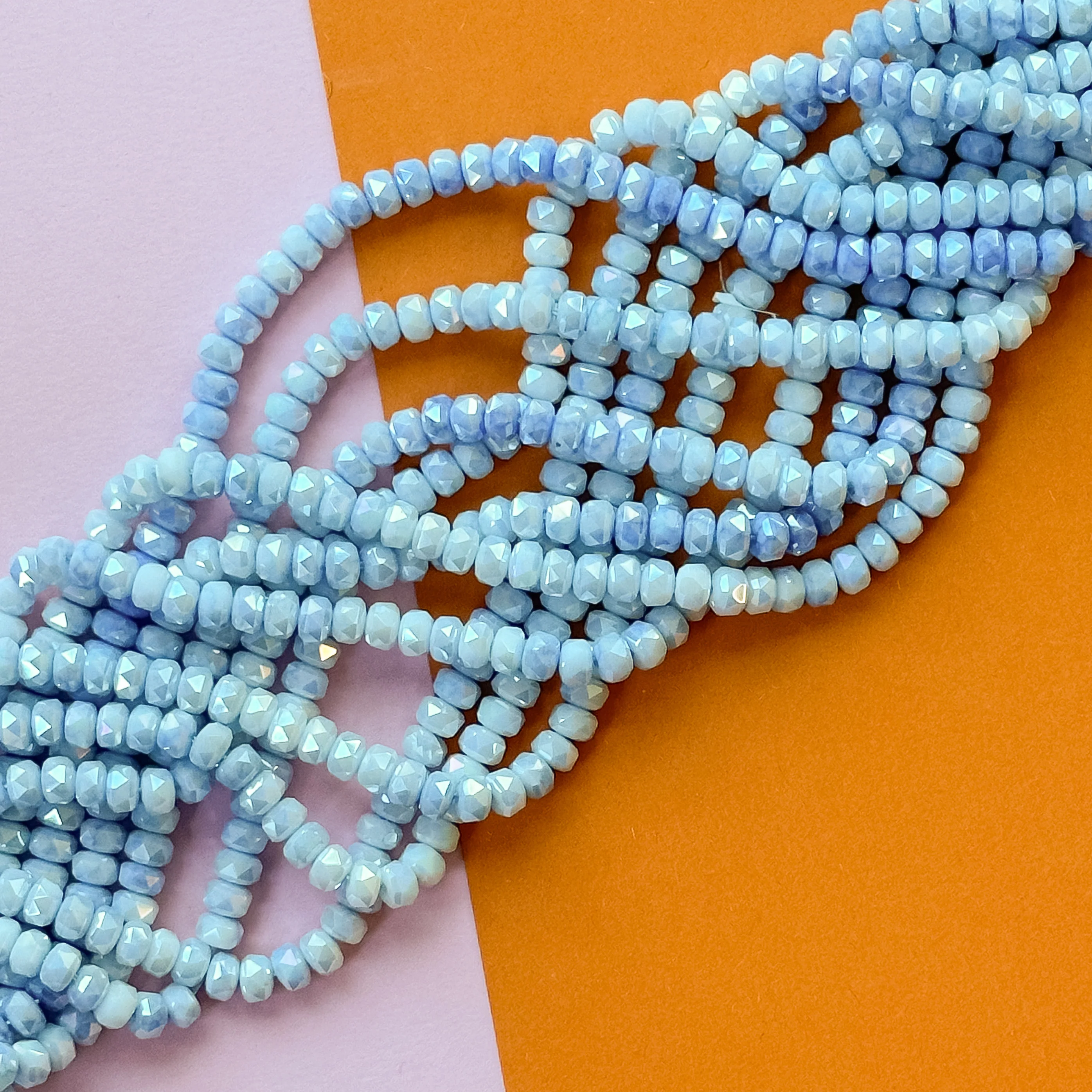 Opaque, light blue swirled faceted crystal rondelle beads with fancy cut and iridescent "diamond" finish.Â