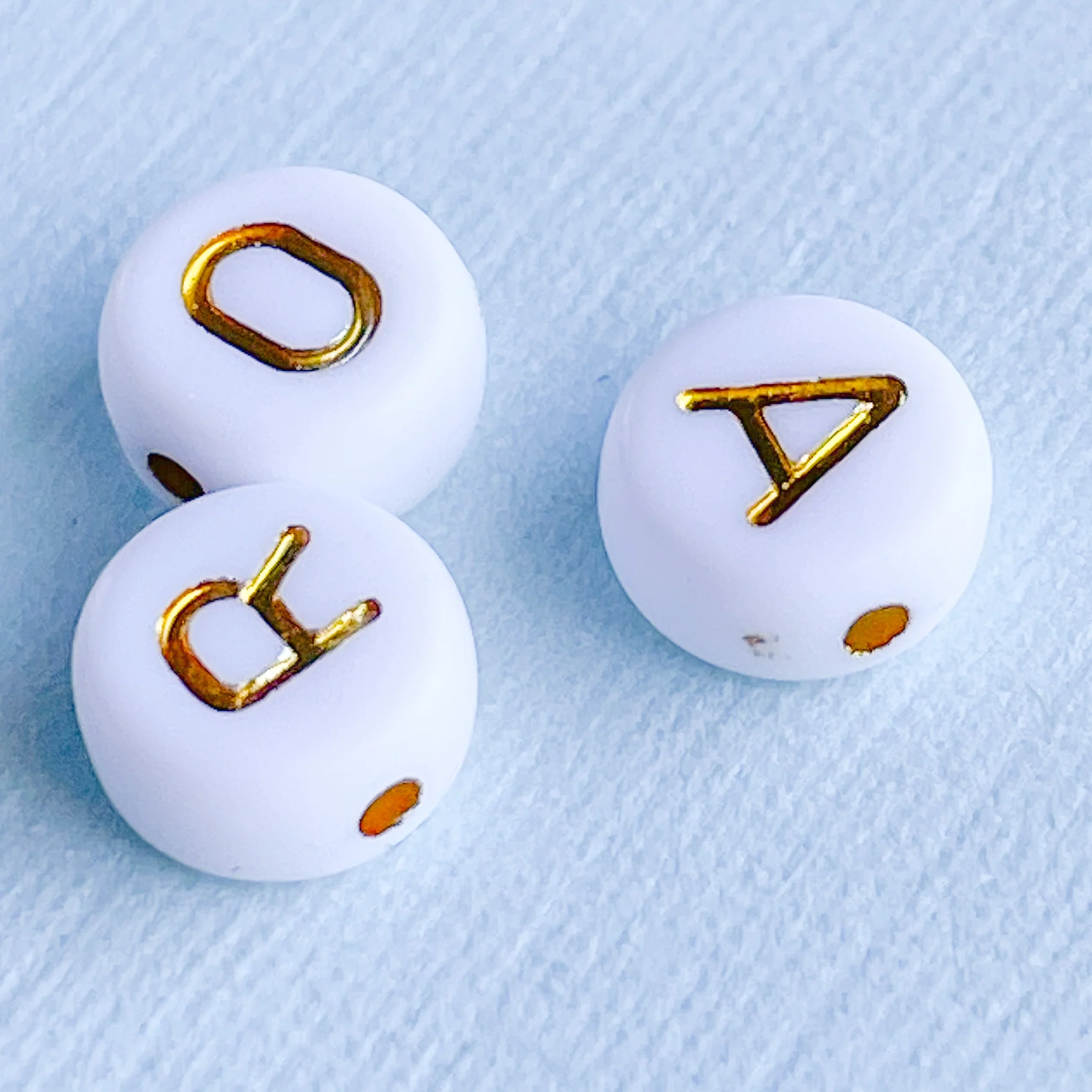 Each white acrylic bead has an imprinted gold letter on each side of the bead. Each pack of letters features approximately 300 beads, with as much variety in assortment as possible. All letters are gold, and there are no number or heart beads. If you need specific letters, please consider purchasing an extra package. Â