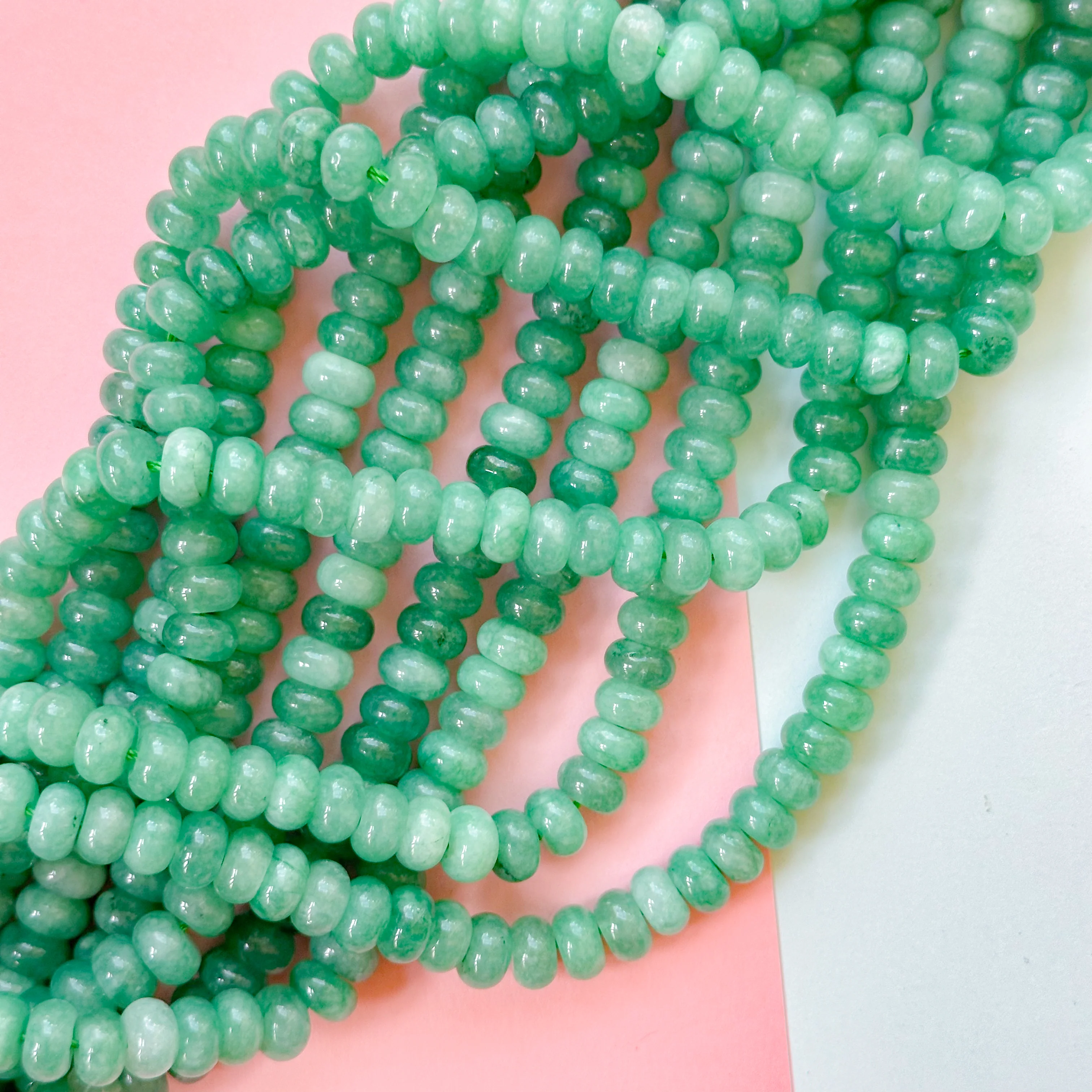 Intriguing, slightly variegated, cactus green smooth Jade rondelles with shiny finish.