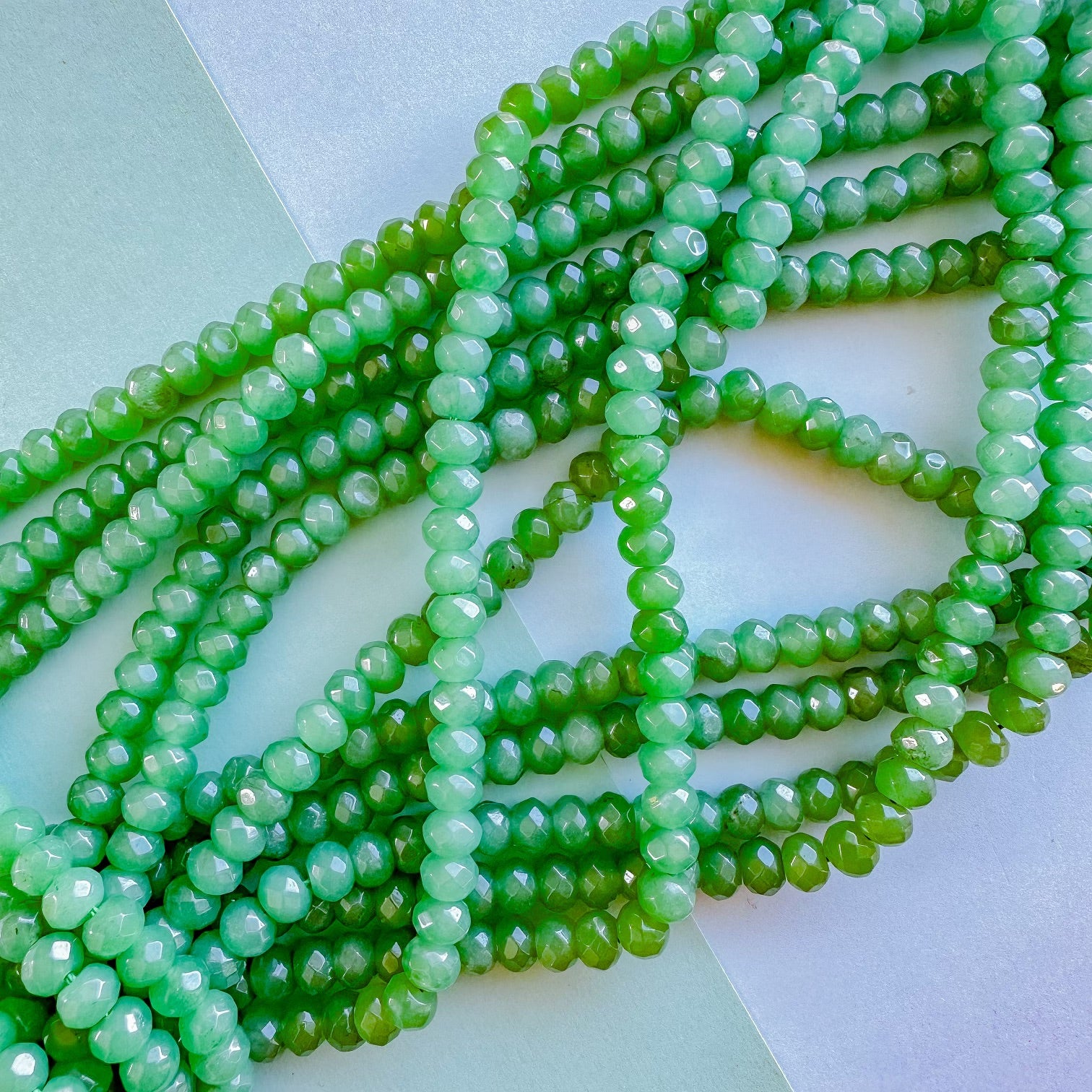 Sparkling, faceted medium green dyed jade rondelles. Ligther than rivulet, close to aventurine.