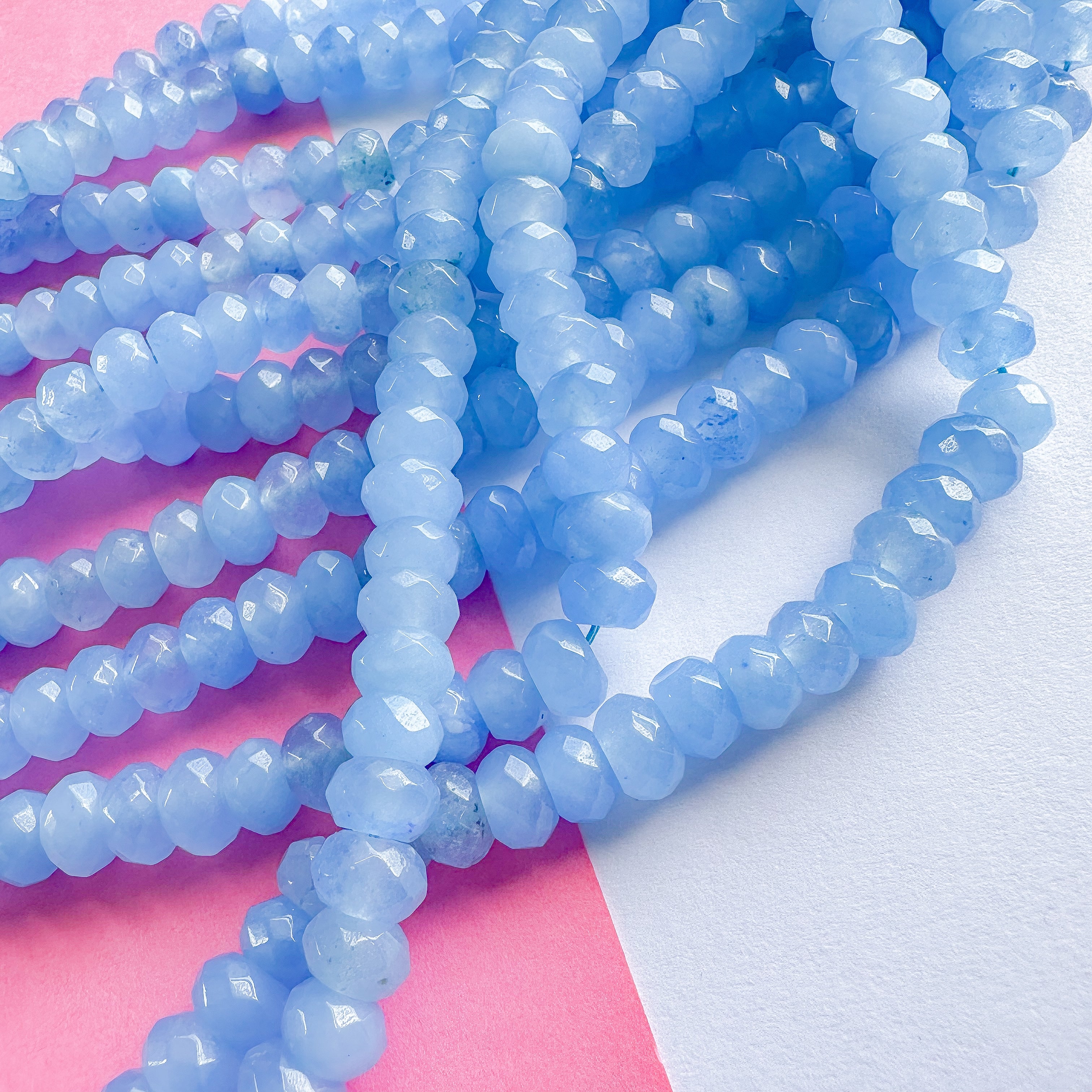 Semi-translucent, crisp light blue rondelles. Faceted, polished dyed Jade.