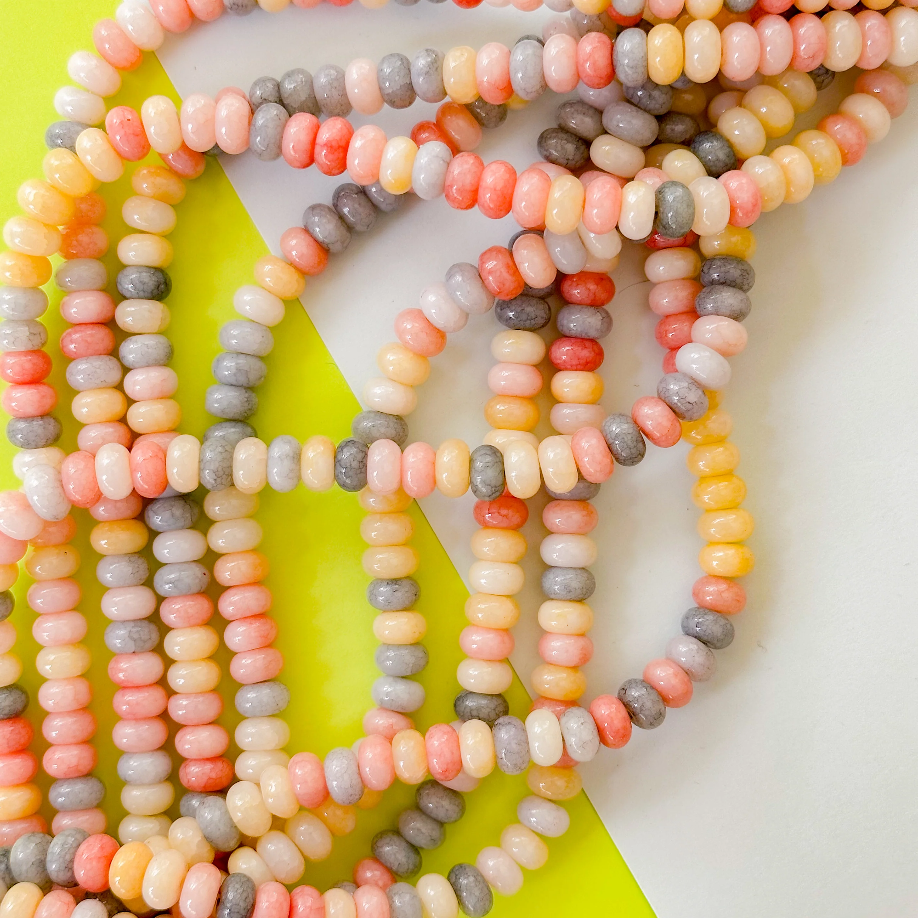 Opaque, variegated soft peach, white, yellow and gray smooth rondelles with shiny finish.