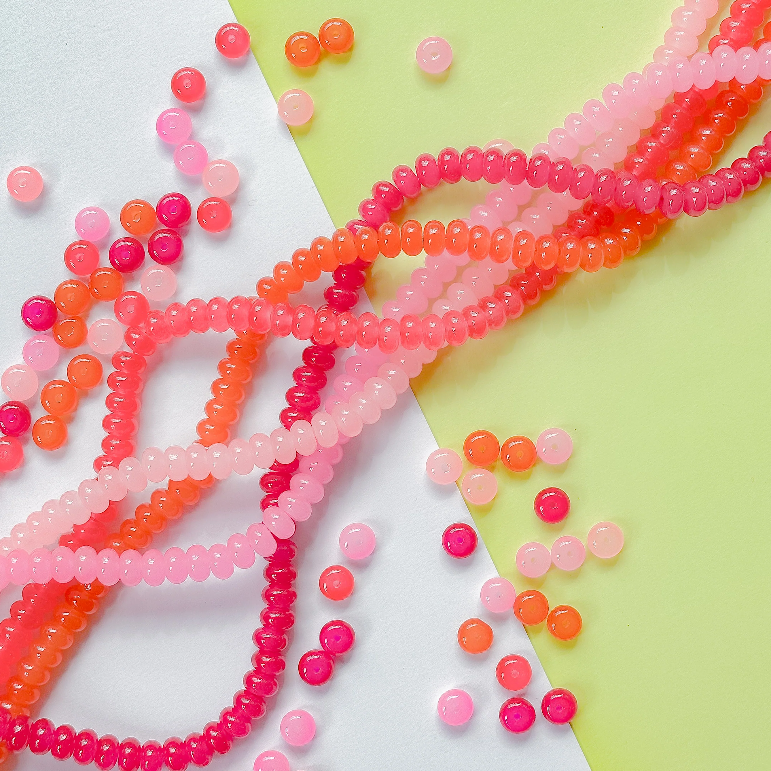 Five candy-colored strands of smooth glass rondelles in curated pinks and orange.Â