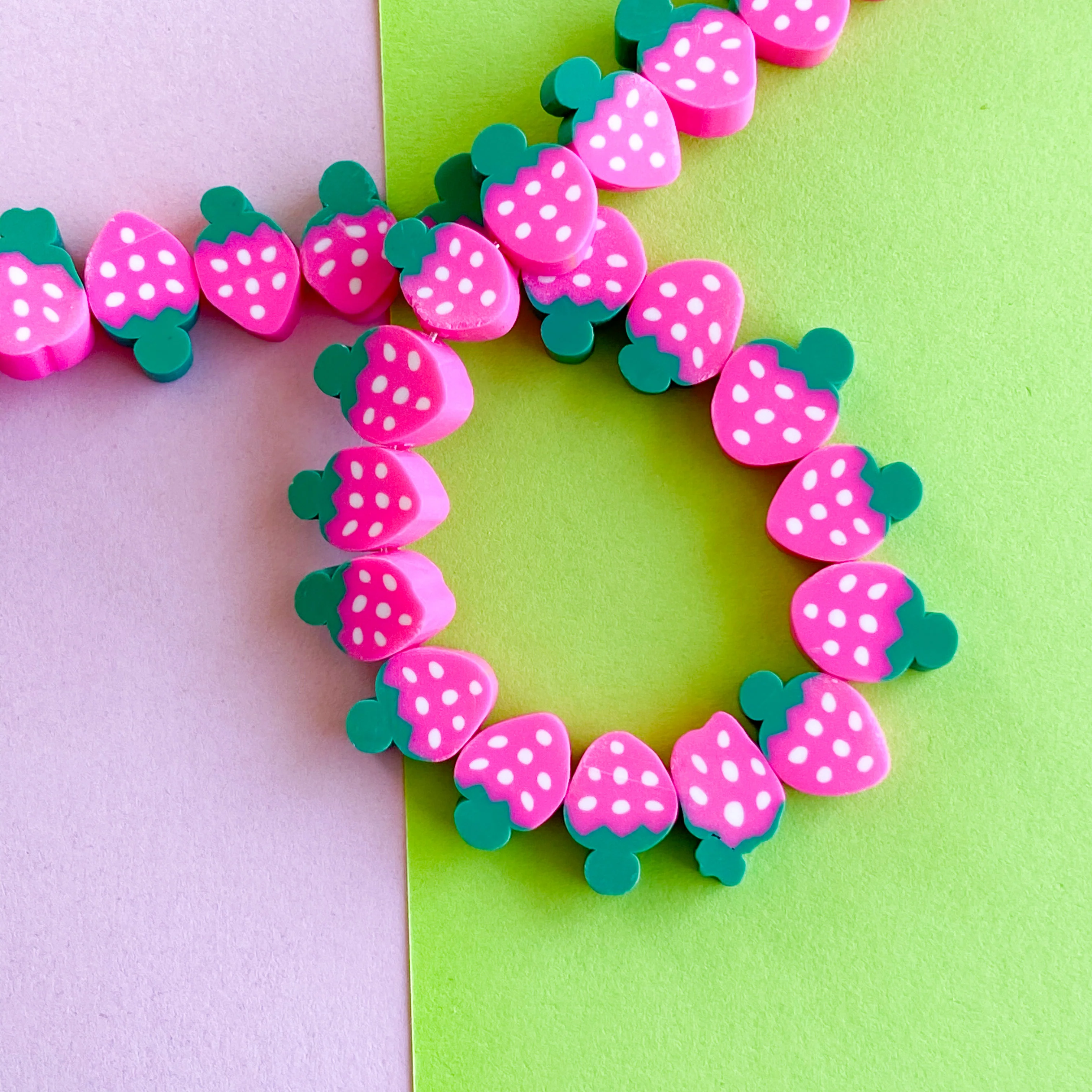 Hot pink, soft green, and white seeded handmade, strawberry-shaped polymer clay beads. Please expect some variety in the strands, not every strawberry is exactly the same as their neighbor.
