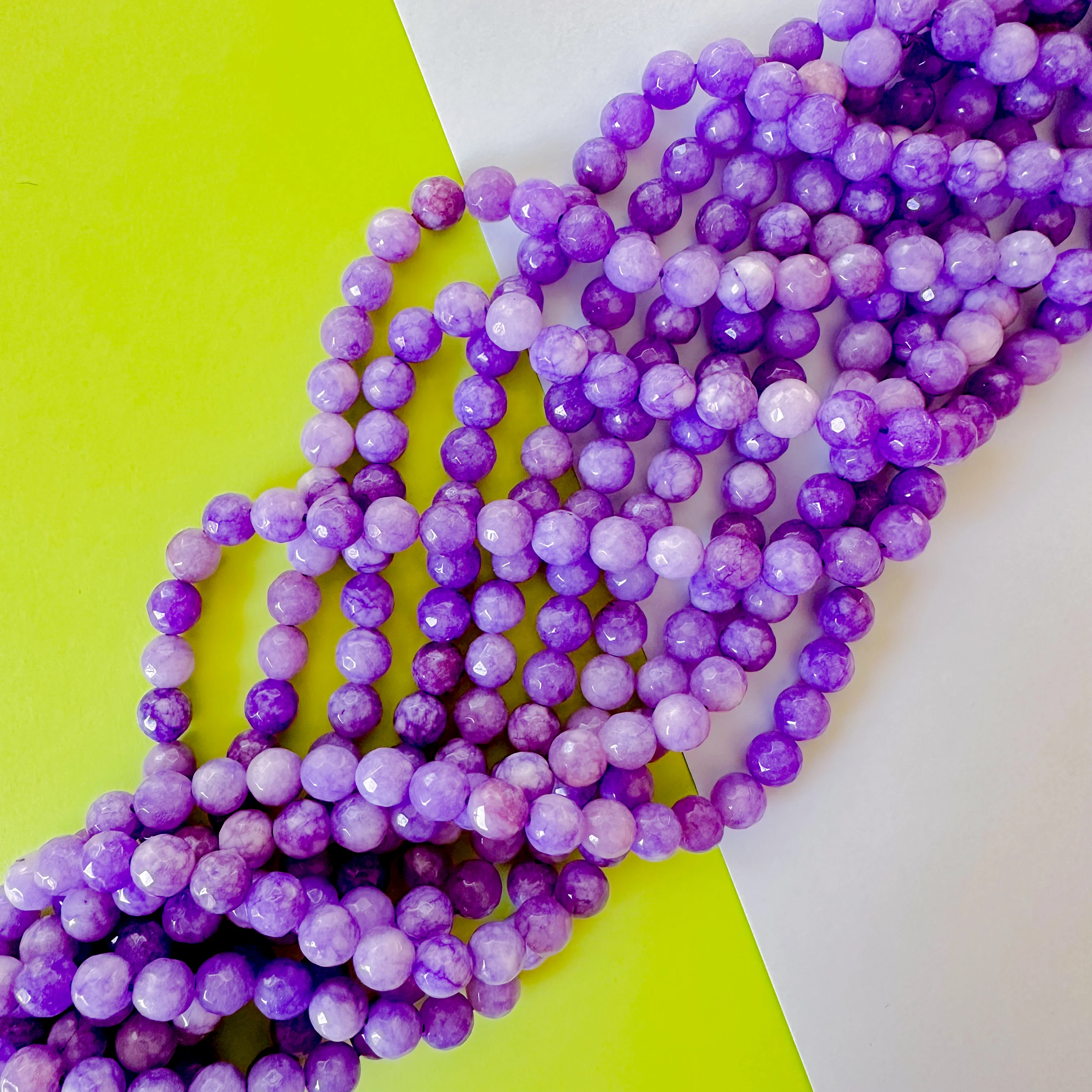 Lightly faceted dyed Jade rounds in variegated purple shades.