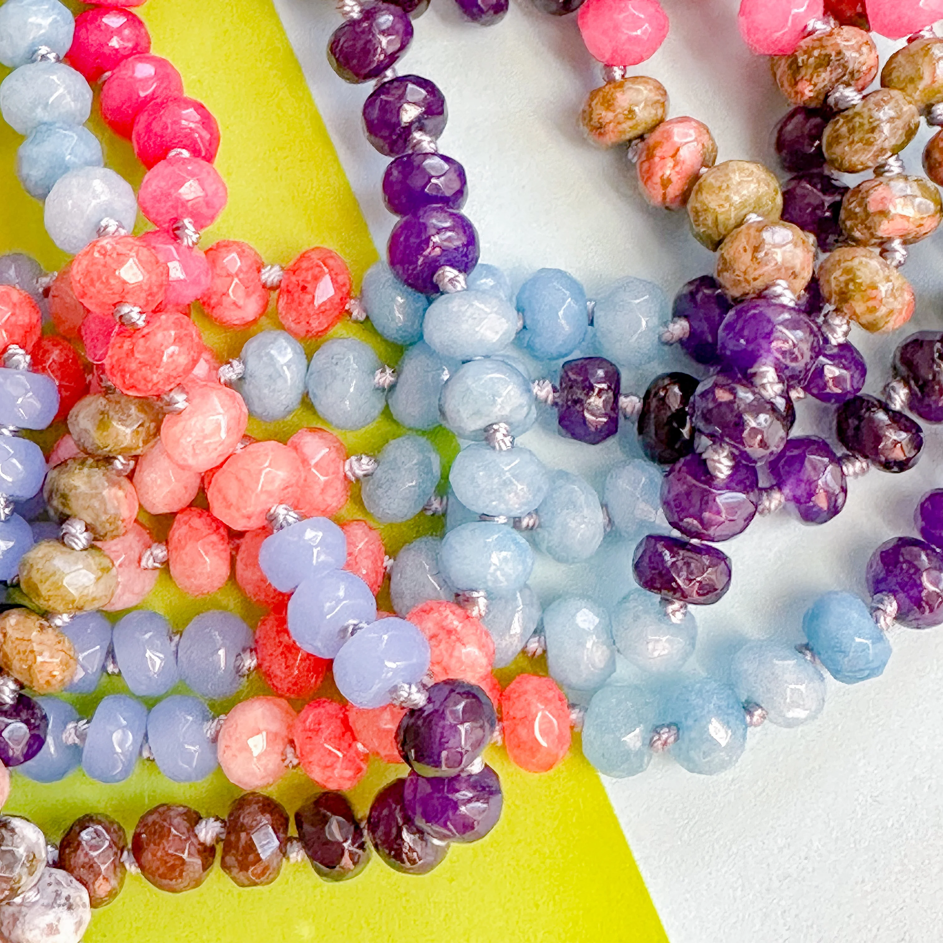 Your rainbow dreams have come true! The perfect combo of faceted, polished dyed and natural rondelle stones in jewel candy colors curated just for you. Pre-knotted on silver nylon cord on a 17.5" strand. Each strand has 5.5" of excess nylon at each end for the addition of beads or clasp.