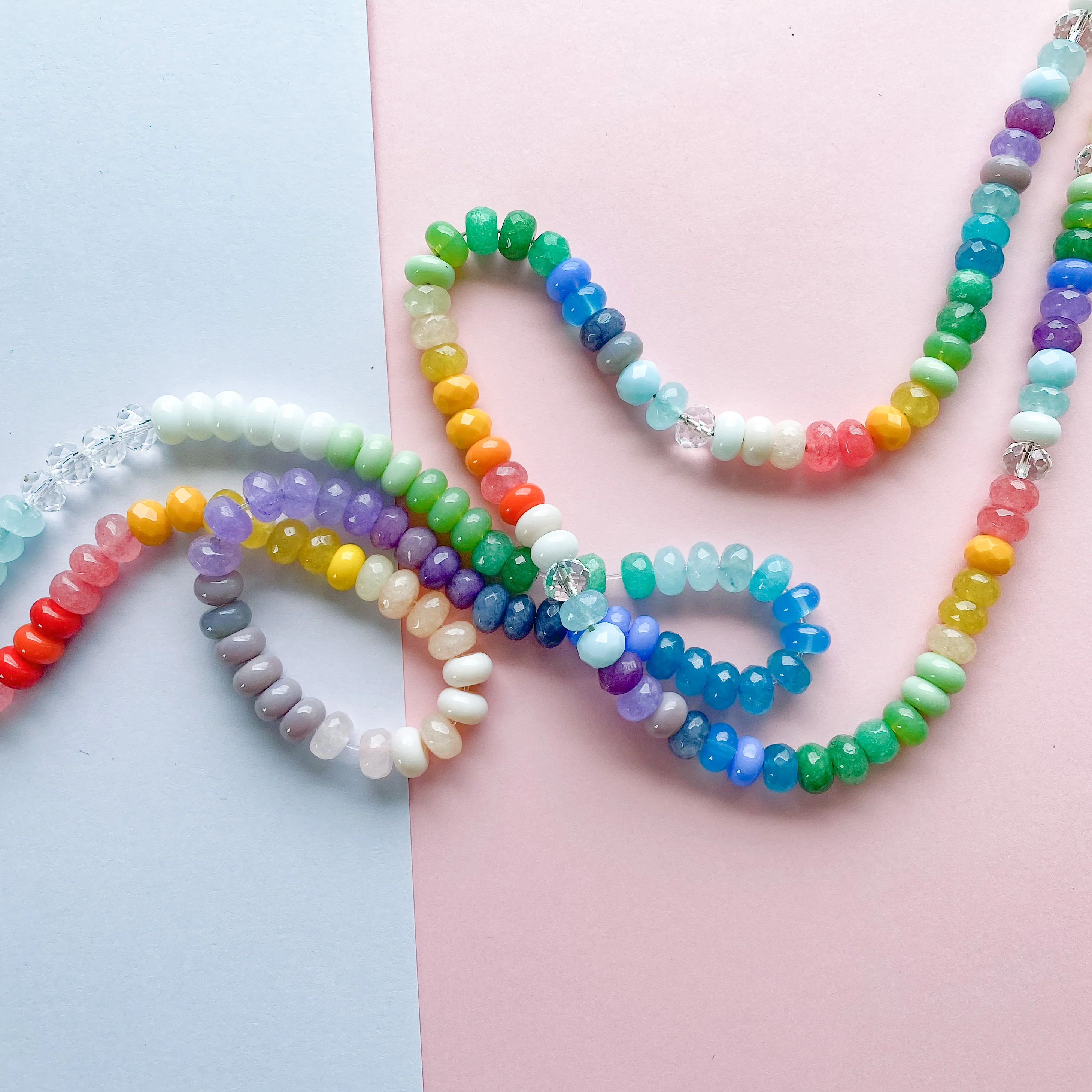 Enjoy a spectrum of colorful stone, crystal and glass beads, perfect for knotting or stringing. Each blend features a mix of dyed Jade rondelles, smooth opaque glass, and faceted crystal.