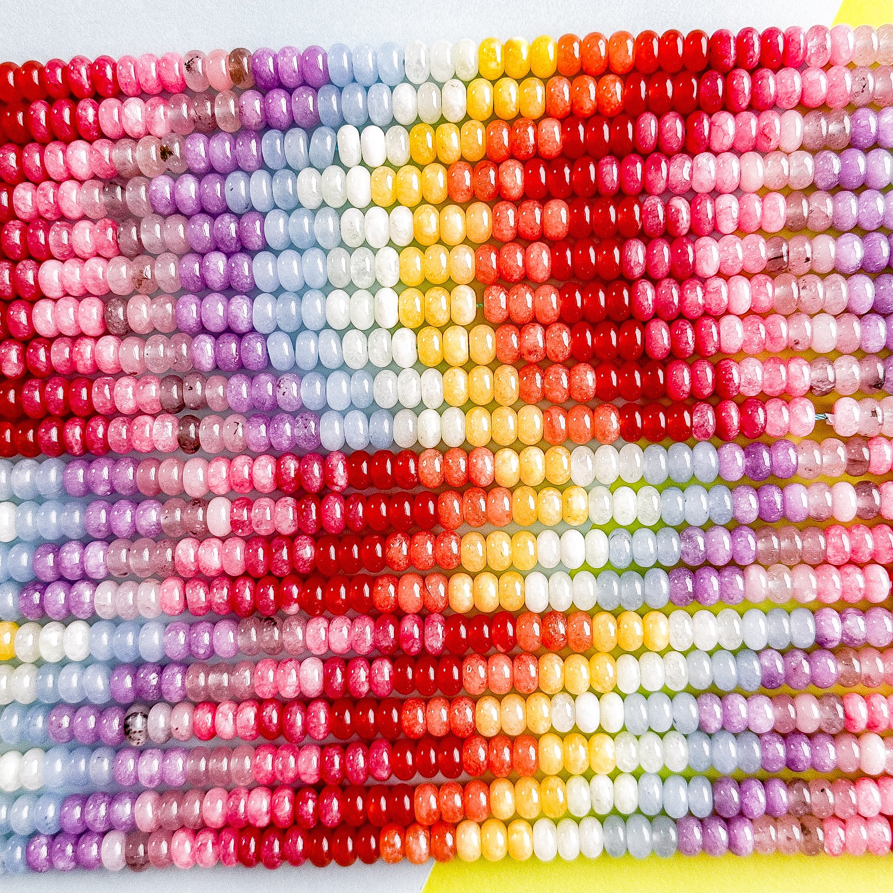 Your rainbow dreams have come true! The perfect strand of smooth, polished dyed Jade rondelles in candy colors curated just for you. String or knot as a necklace and simply add a clasp or add these to your next stretchy stack.Â