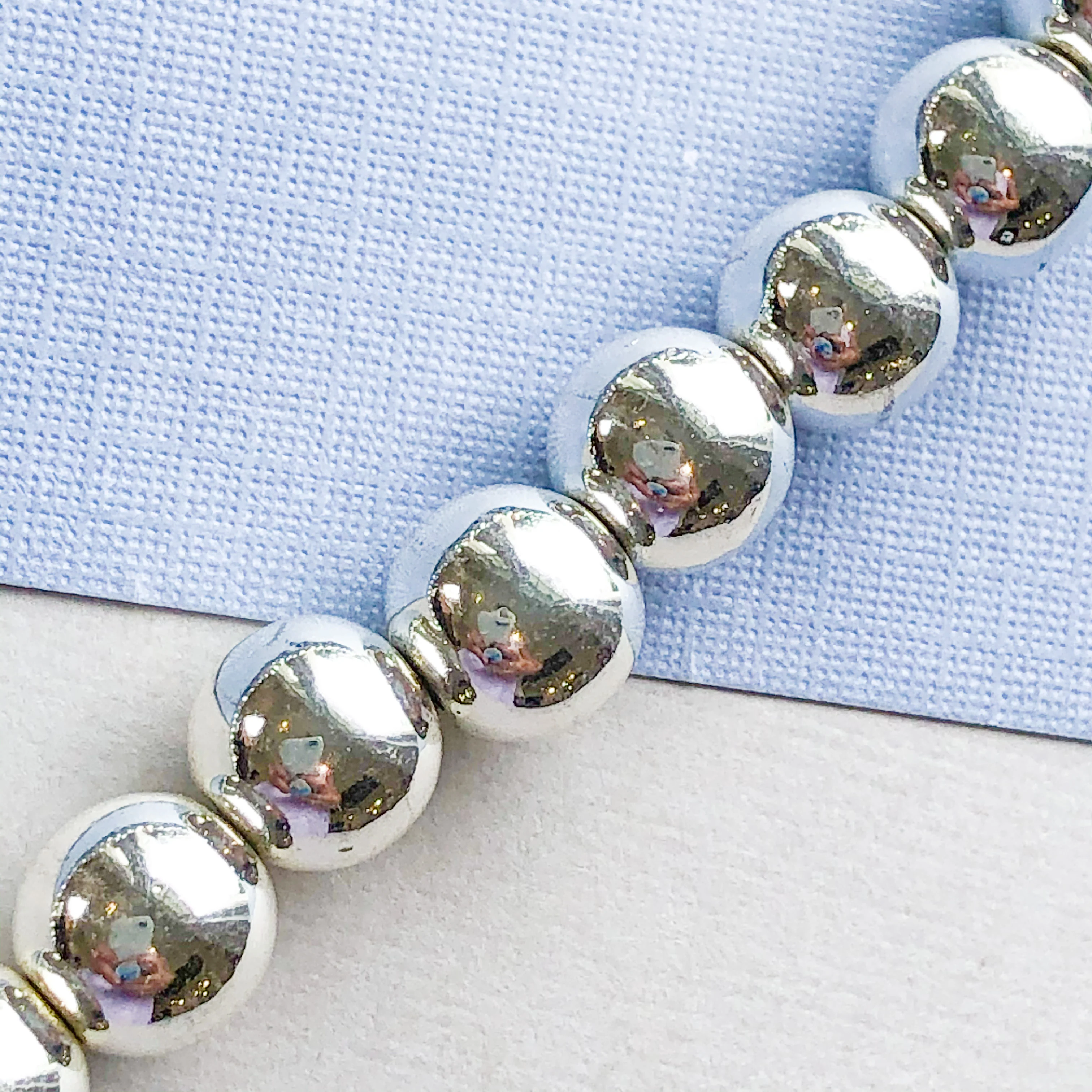 A strand of silver coated hematite rounds with a mirror finish.