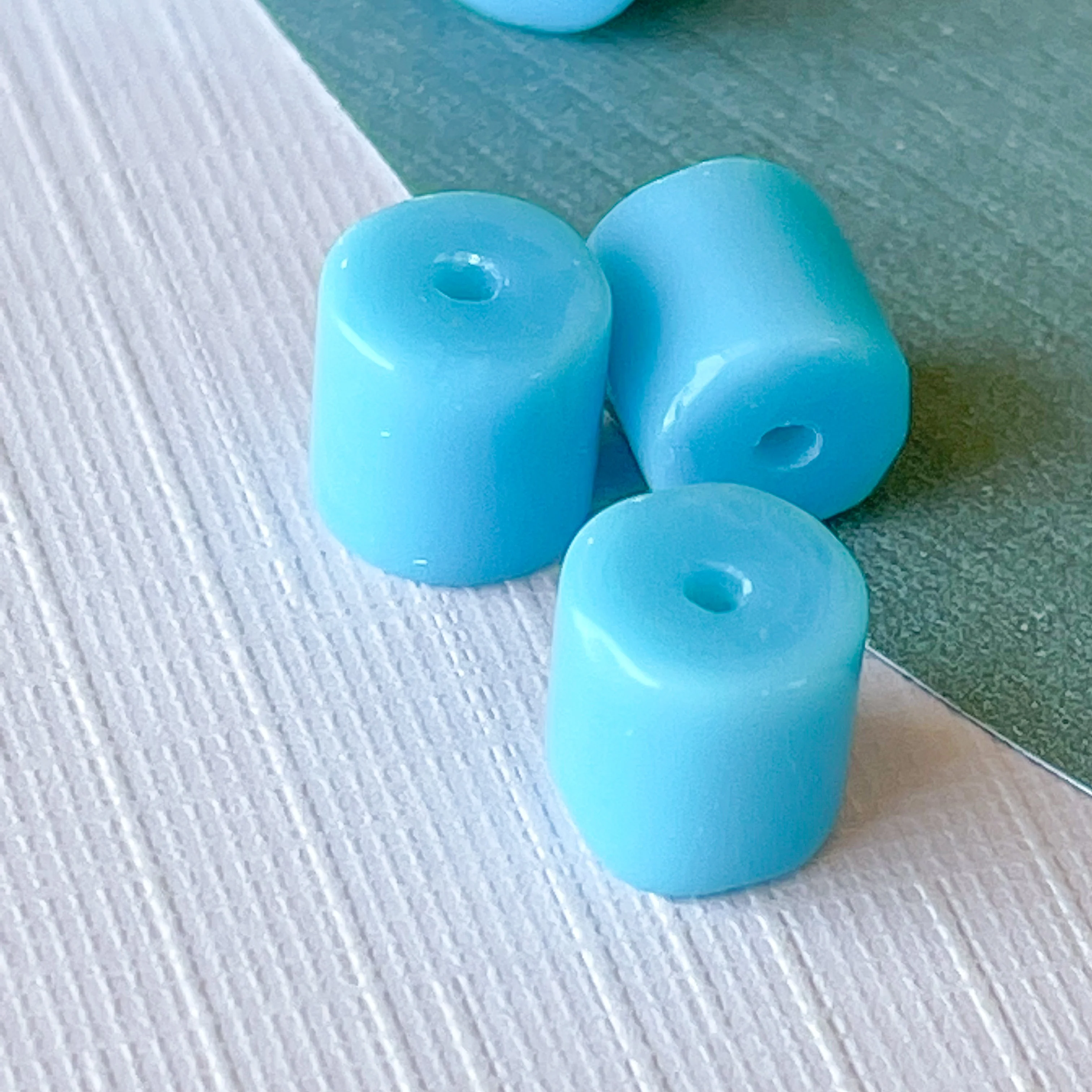 Bright light blue, smooth, opaque glass cylinder beads.Â
