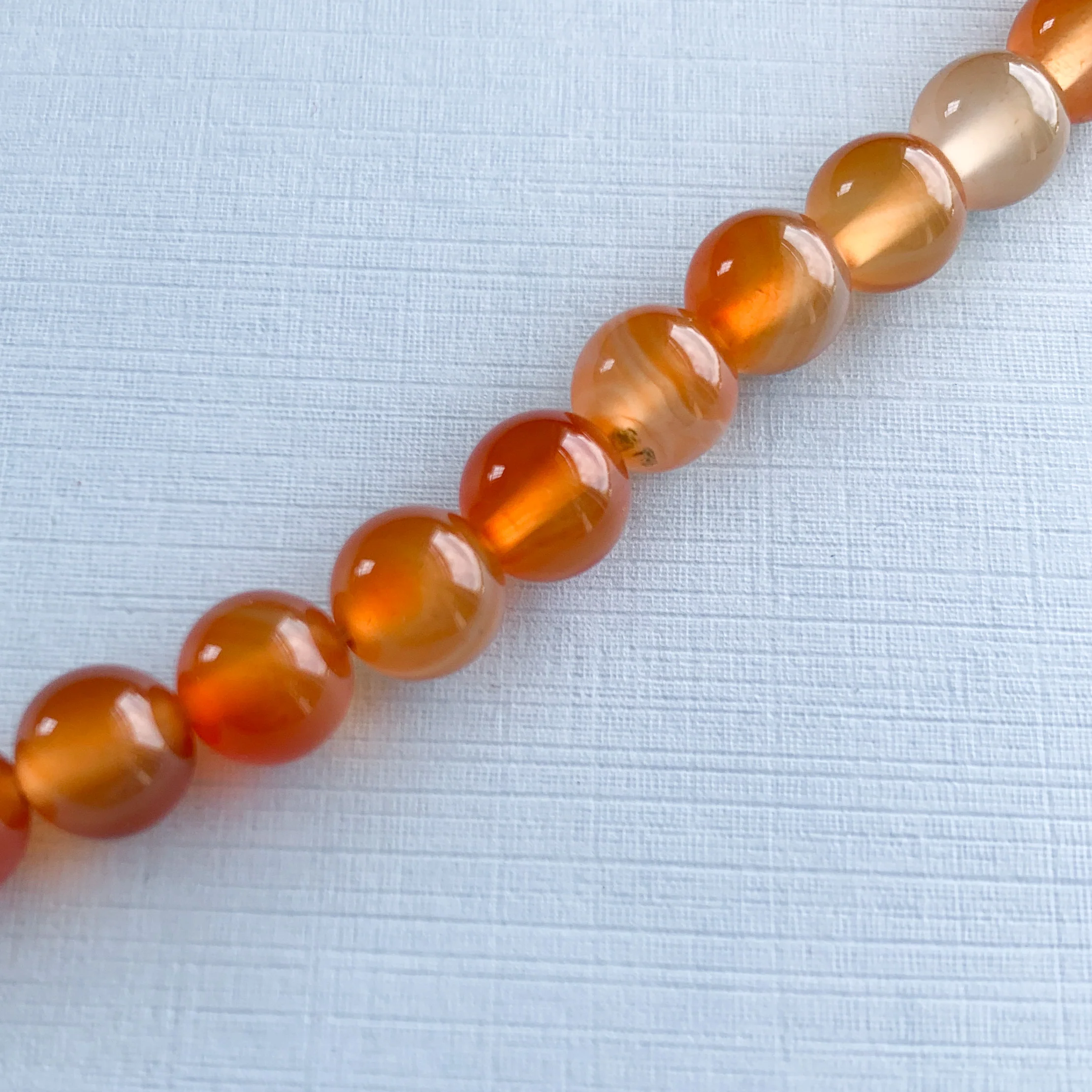 A smooth round orange/red beads with a glossy finish. Some are almost clear.Â