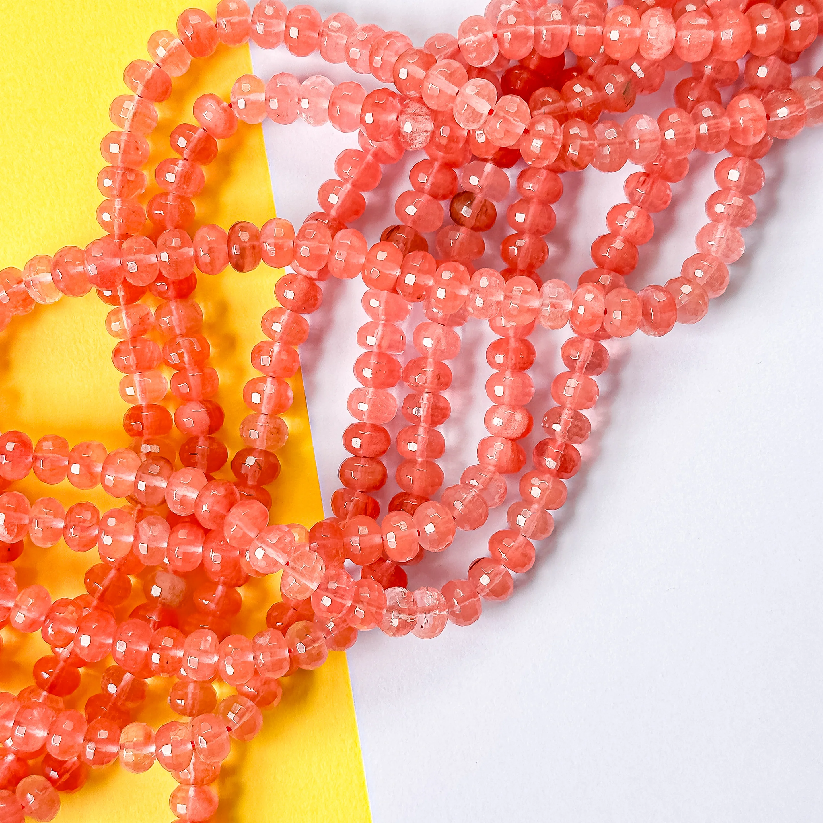 A strand of faceted, translucent faceted rondelles. "Strawberry Quartz" is a heat treated stone known for it's vibrant coral-pink hue.Â