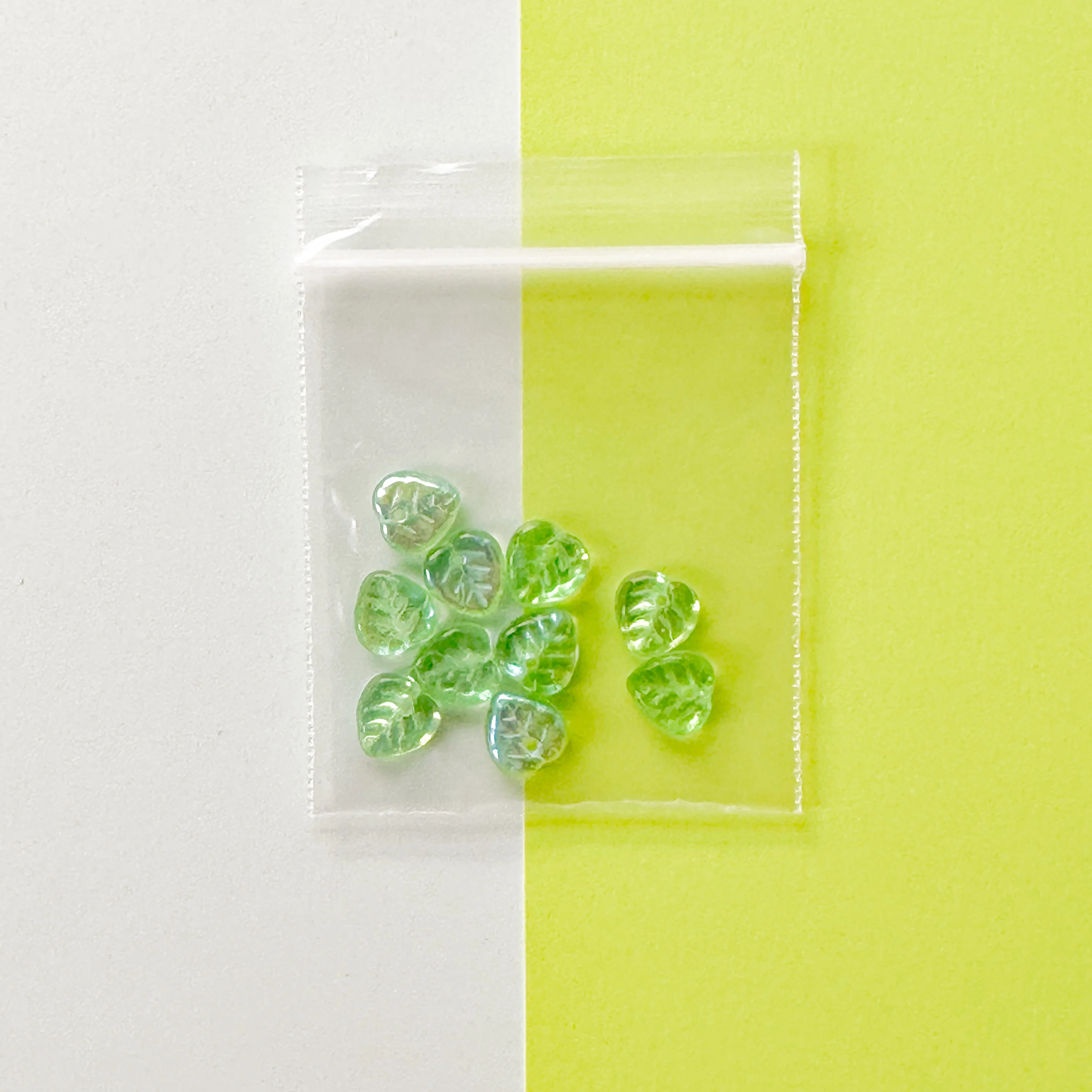 Shiny, translucent green glass leaves with iridescent AB finish on one side. Top drilled from front to back.Â