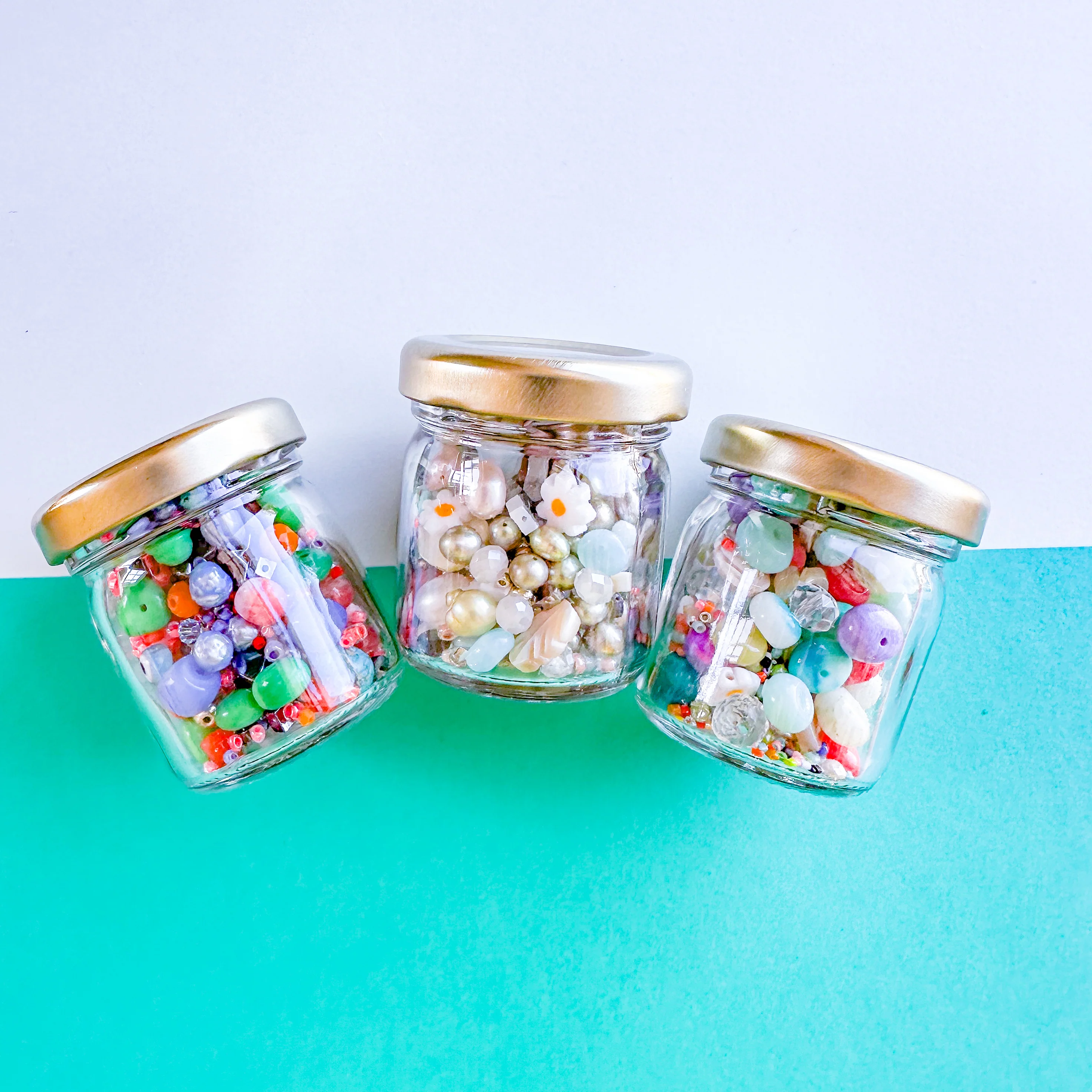 Sold by weight. Each reusable glass jar contains 50 grams of assorted beads.Â