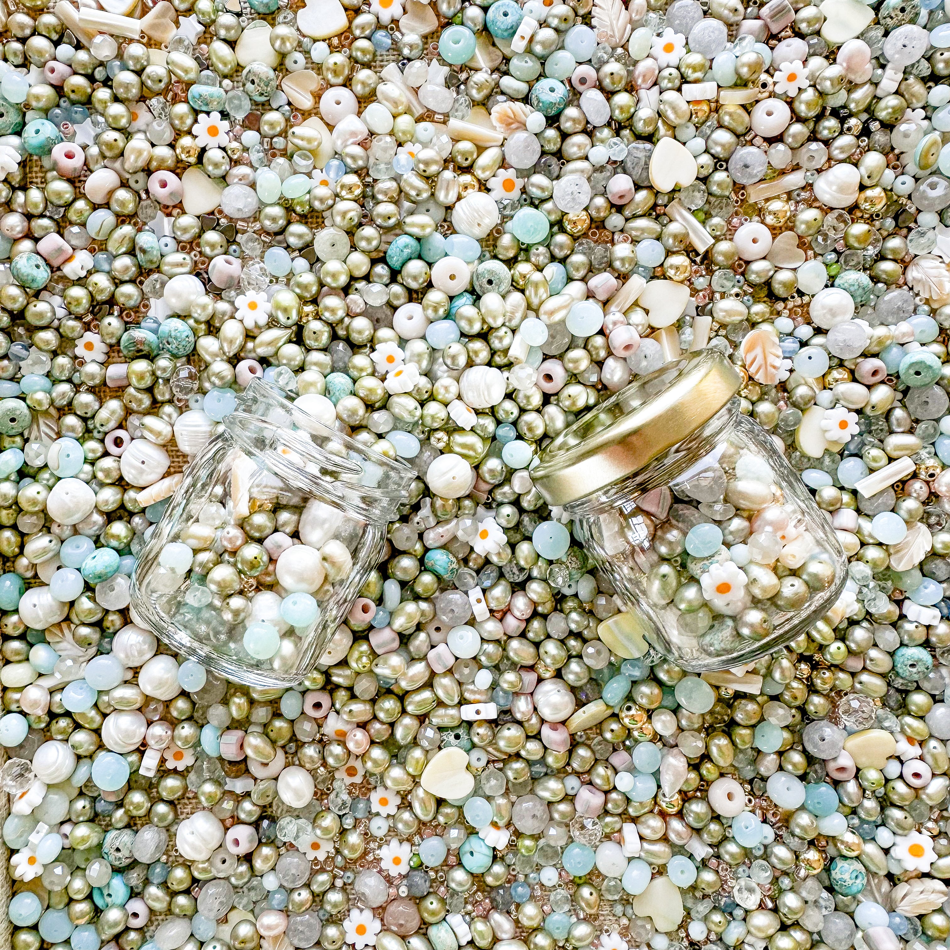A rich and calming blend of candy Opal rondelles, Mother of Pearl shapes, Jade rondelle beads, Imperial Jasper, Millefiori glass daisies, Toho seed beads, petite crystals, Freshwater Pearls, and assorted stones like gold Hematite, Aquamarine and Agate. Our Clover Caviar is a feast for the eyes and ideal for knotting, stringing or wire work. Your next project awaits!