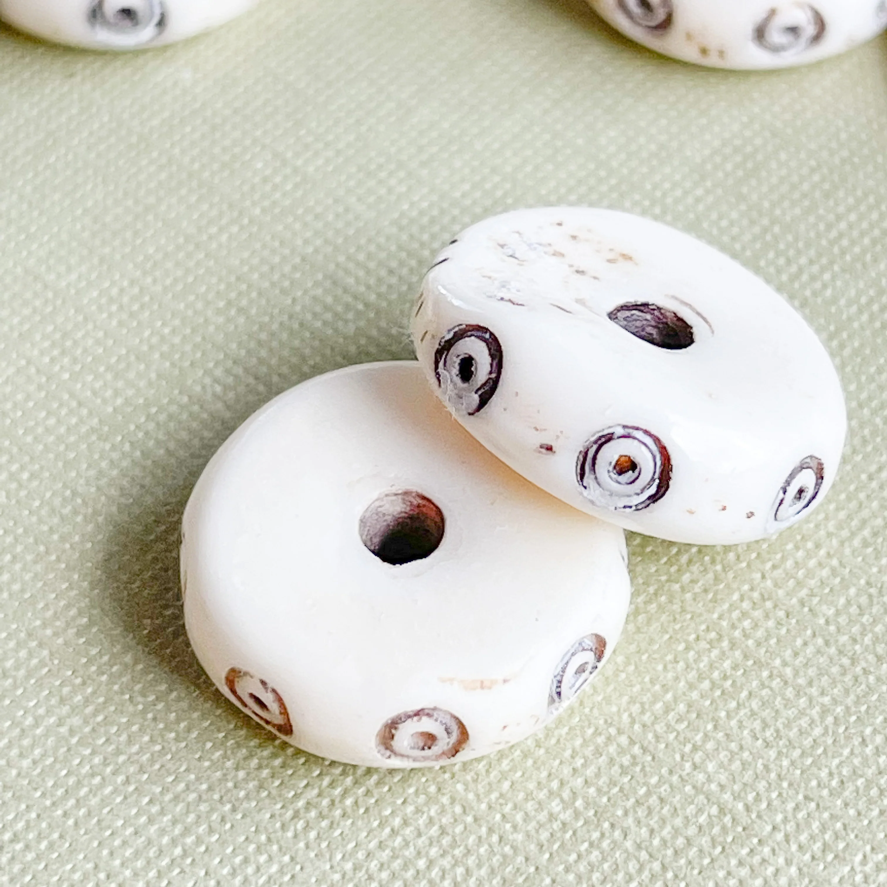 Hand-carved, cream-colored slim bone beads with a "target" designÂ
