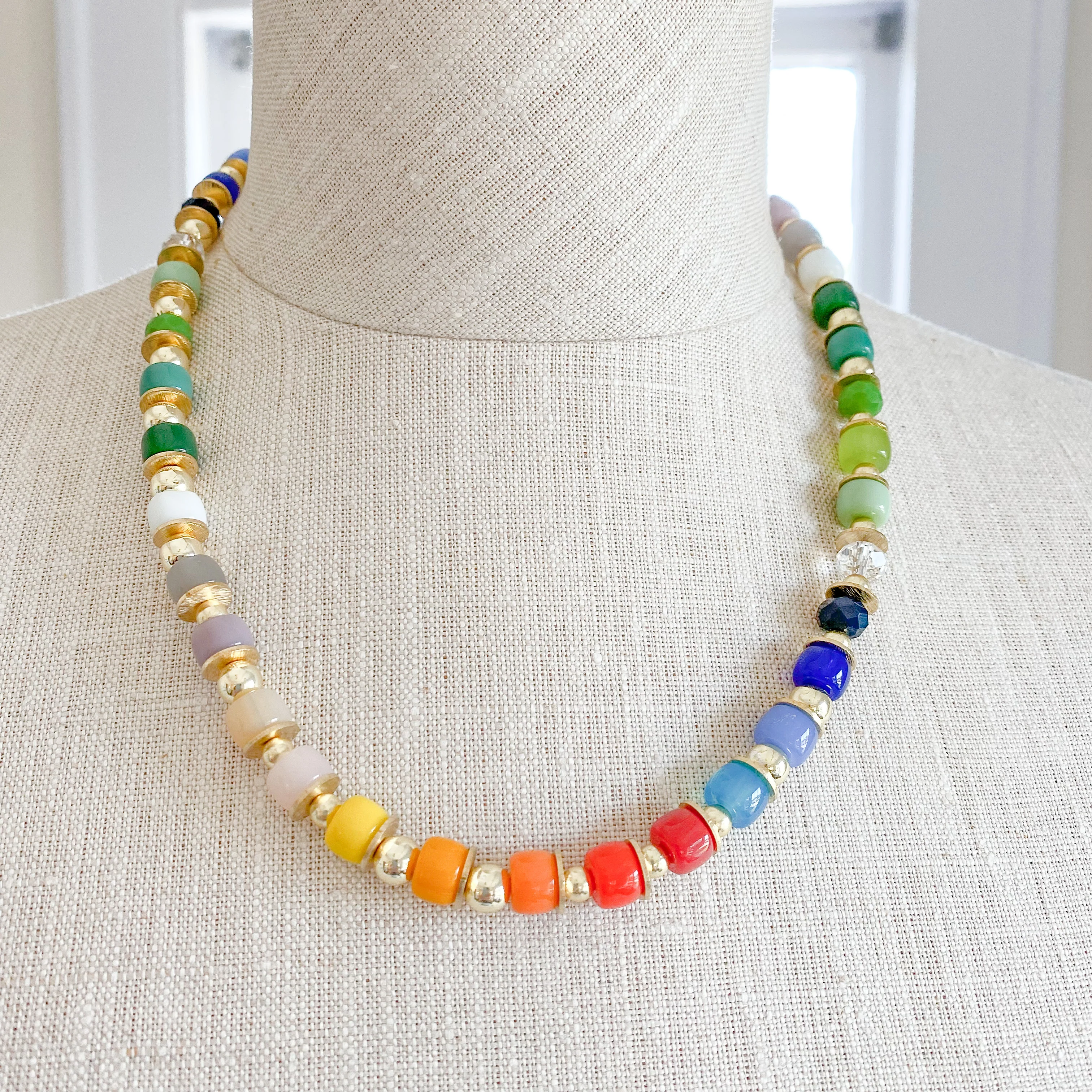 A stunning array of our best selling 8mm multicolor glass roller beads, 8mm crystal rondelles, and picture-perfect gold accent beads.