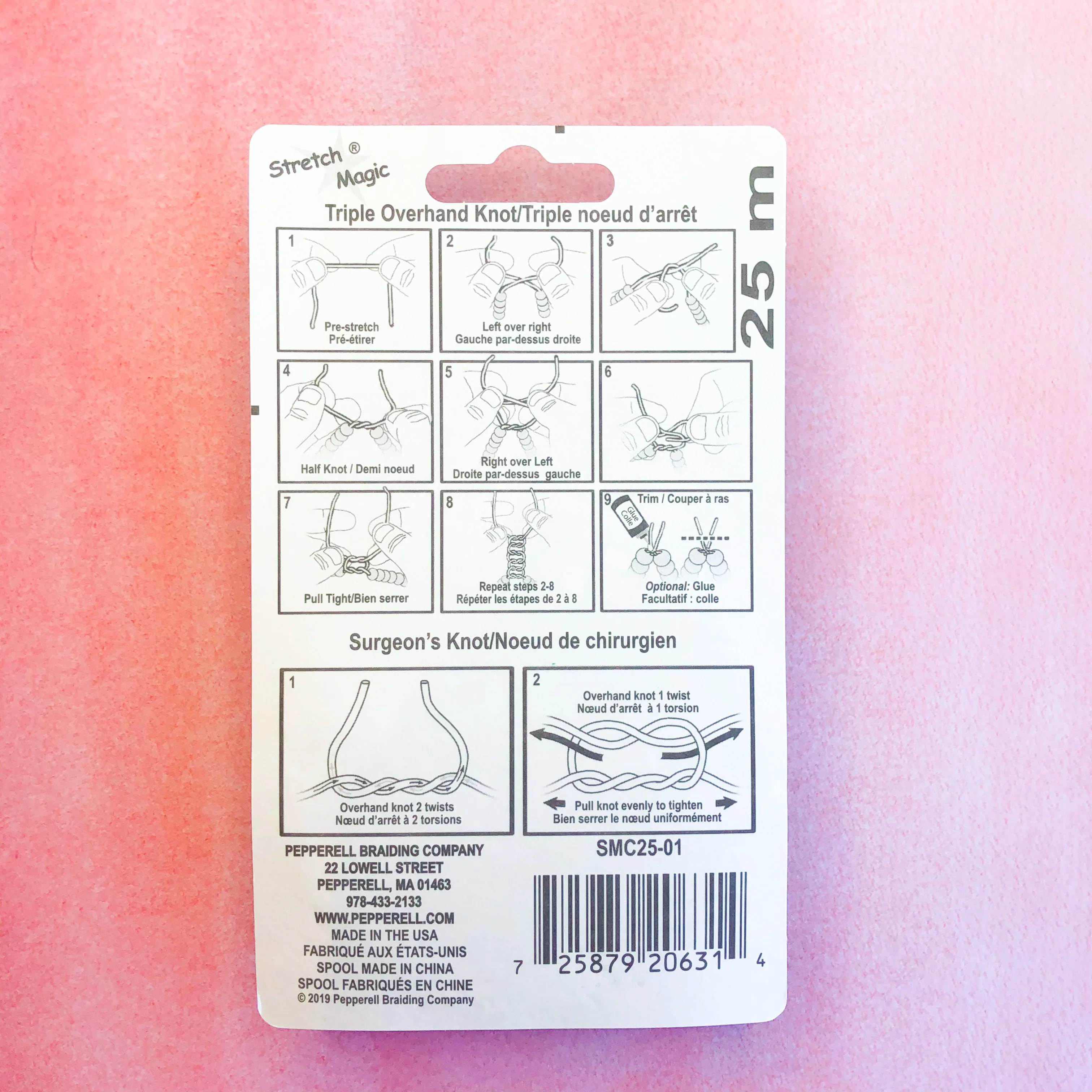 Durable elastic for stringing stretchy bracelets. This is the thinnest size of stretch magic we sell. Ideal for your smallest beads! This is enough stretch for approximately 75 bracelets.