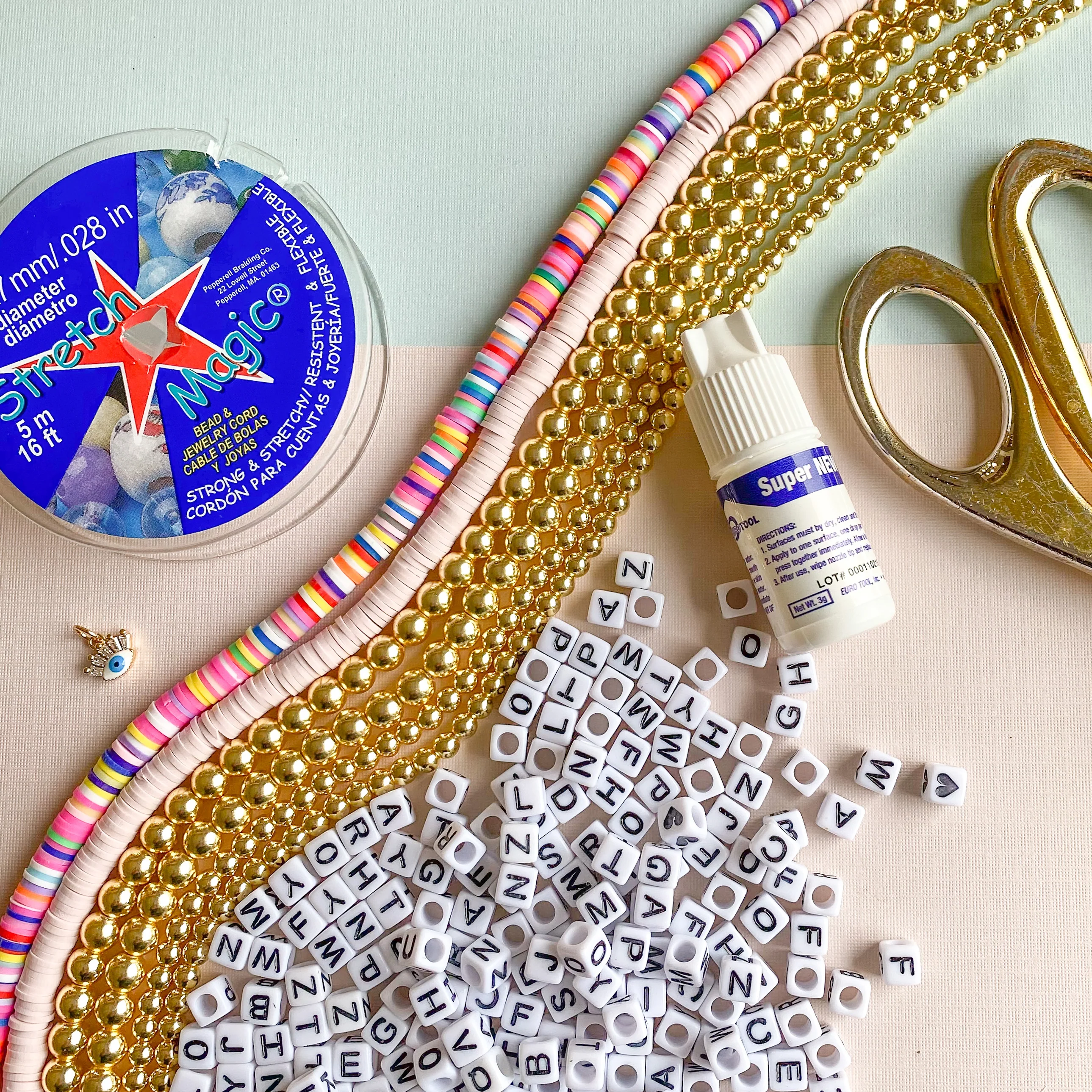 Creating this bright stack is easier than you think! Our stretchy bracelet making kits are a great project for all skill levels including beginners. As always, all you'll need is a pair of scissors or cutters, and some tape. Each of our stretchy bracelet kits come with enough materials and supplies to make 12 or more bracelets, depending on your wrist size.