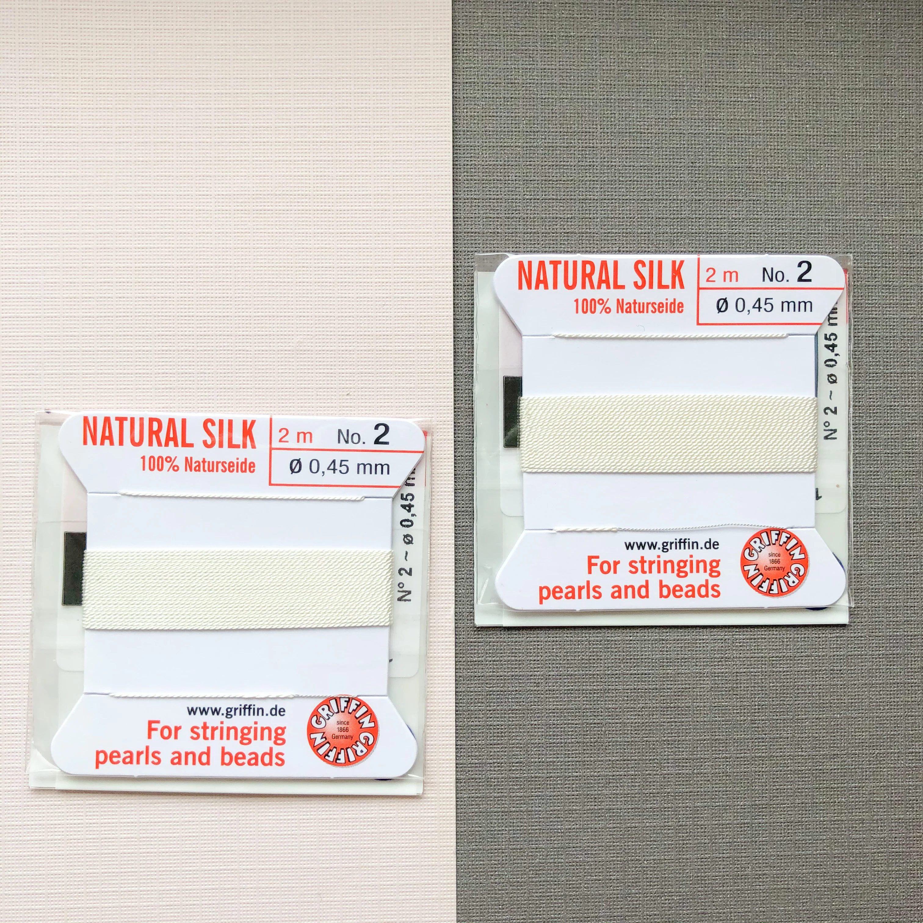 White knotting silk available in Nos. 1, 2, 4, 6, 8, 10, 12, and 14. Each pack comes with 2 meters of cord with a need attached.